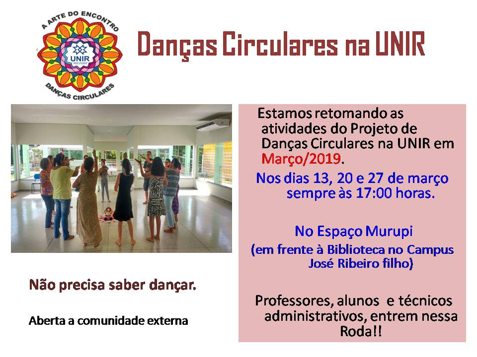 As atividades do Projeto Danças Circulares na UNIR retornarão nos dias 20 e 27 de março, às 17 horas, no espaço MURUPI, em frente a biblioteca no Campus José Ribeiro Filho, em Porto Velho.