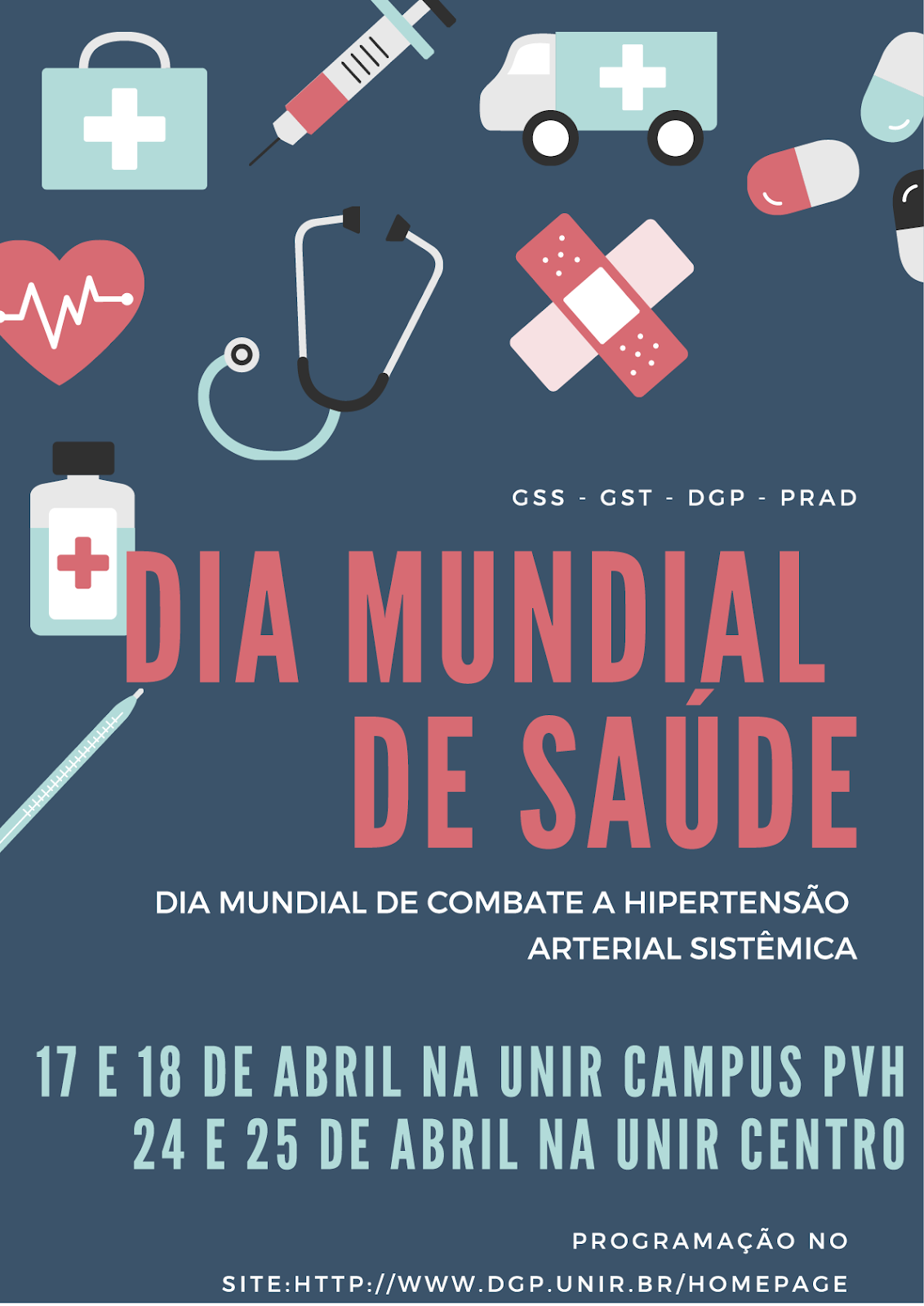 A Pró-Reitoria de Administração (PRAD) da Fundação Universidade Federal de Rondônia (UNIR) por intermédio da Diretoria de Gestão de Pessoas (DGP) comunica aos seus servidores, estudantes e comunidade em geral, a realização de ações de saúde em alusão ao Dia Mundial de Saúde e Dia Mundial de Combate a Hipertensão Arterial Sistêmica, em parceria com o Departamento de Enfermagem da UNIR.