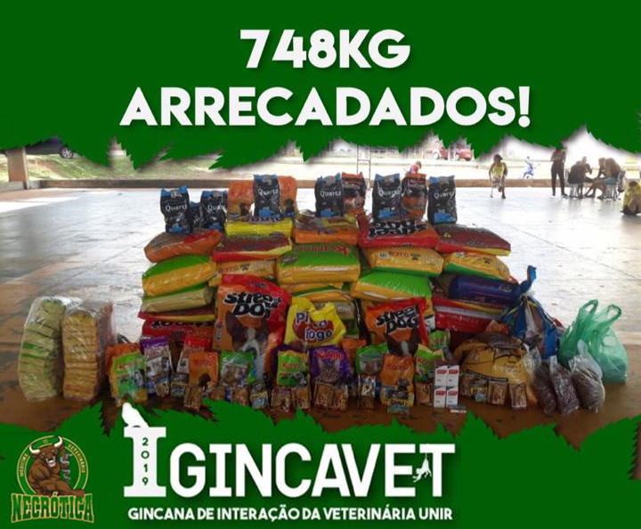 Durante a realização da I Gincana de Interação do curso de Medicina Veterinária de Rolim de Moura (I GINCAVET) da Fundação Universidade Federal de Rondônia (UNIR) as equipes participantes, formadas por acadêmicos e professores, arrecadaram 748 quilos de ração para cães e gatos, que serão doados para as organizações não governamentais "Adotar é Legal" e "Desabandone", bem como para o Centro de Controle de Zoonoses (CCZ), com a intensão de amenizar a situação dos animais assistidos por estas entidades.