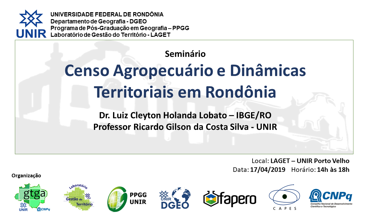 O Departamento de Geografia (DGEO) e o Programa de Pós-Graduação em Geografia (PPGG) da Fundação Universidade Federal de Rondônia (UNIR) realizam a atividade acadêmica Seminário “Censo Agropecuário e Dinâmicas Territoriais em Rondônia”, no dia de hoje 17/04/2019, das 14h às 18h, no Laboratório de Pesquisa em Gestão do Território (LAGET), sala 11, 2º piso do prédio da Geografia, no Campus José Ribeiro Filho, em Porto Velho.