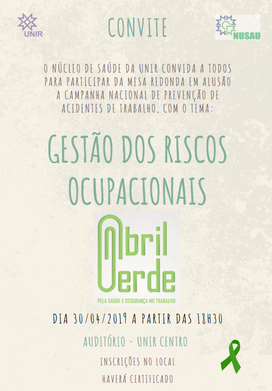 O Núcleo de Saúde da Fundação Universidade Federal de Rondônia (UNIR) realizará uma mesa redonda em alusão à Campanha Nacional de Prevenção de Acidentes de Trabalho. O evento acontecerá a partir das 18h30 da terça-feira, 30, no auditório da UNIR-Centro, e terá como tema “Gestão dos Riscos Ocupacionais”.