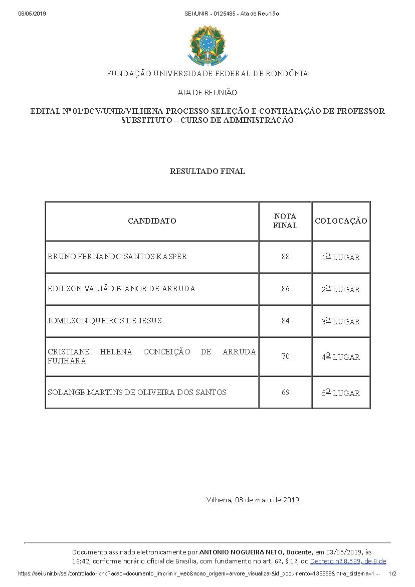 A Direção do Campus de Vilhena da Fundação universidade federal de Rondônia (UNIR) torna público o resultado final do processo seletivo referente ao Edital Nº 01/DCV/UNIR/VILHENA, para contratação de Professor Substituto para o Curso de Administração.