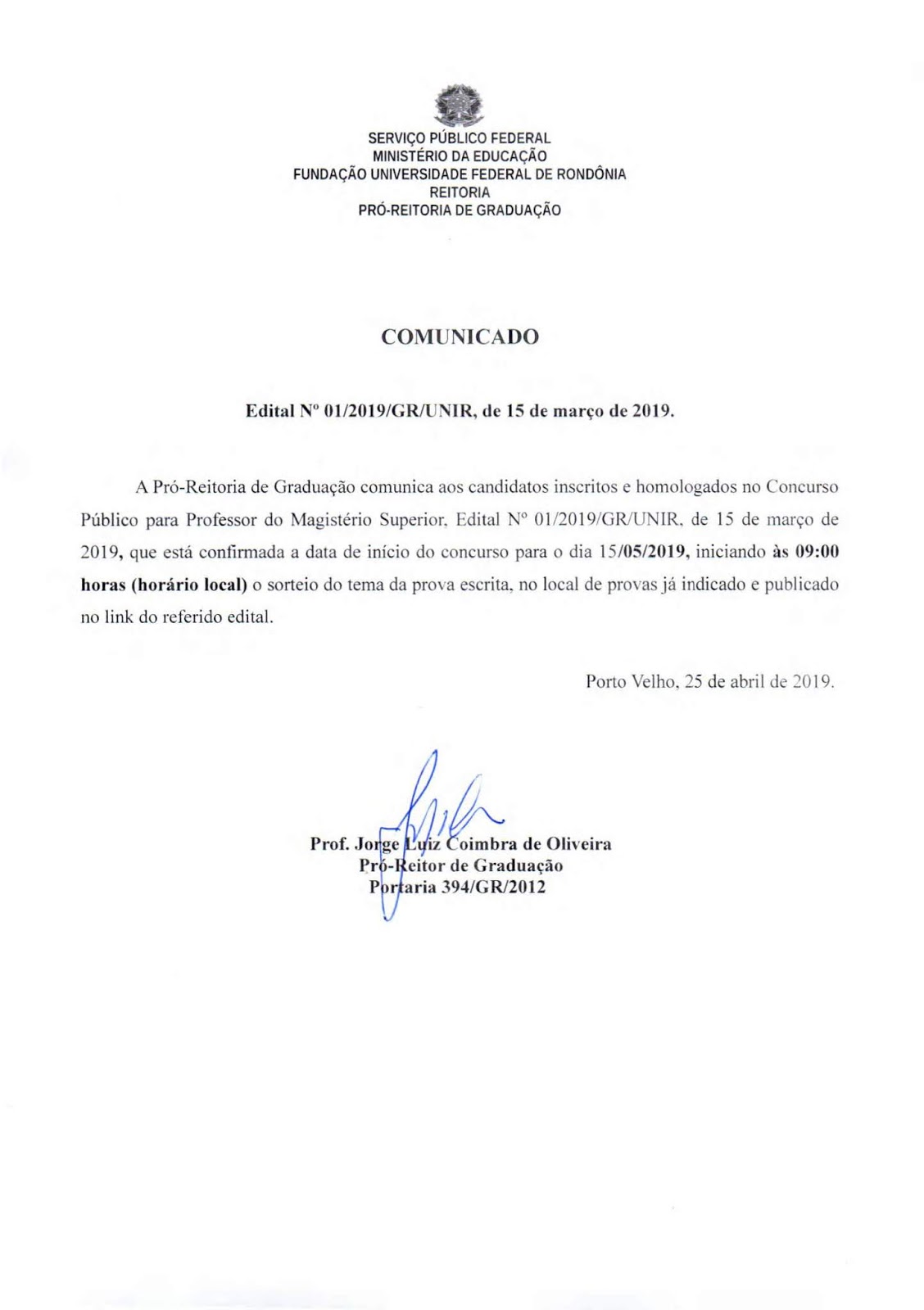 Edital nº 01/2019/GR/UNIR - Início do concurso será no dia 15 maio