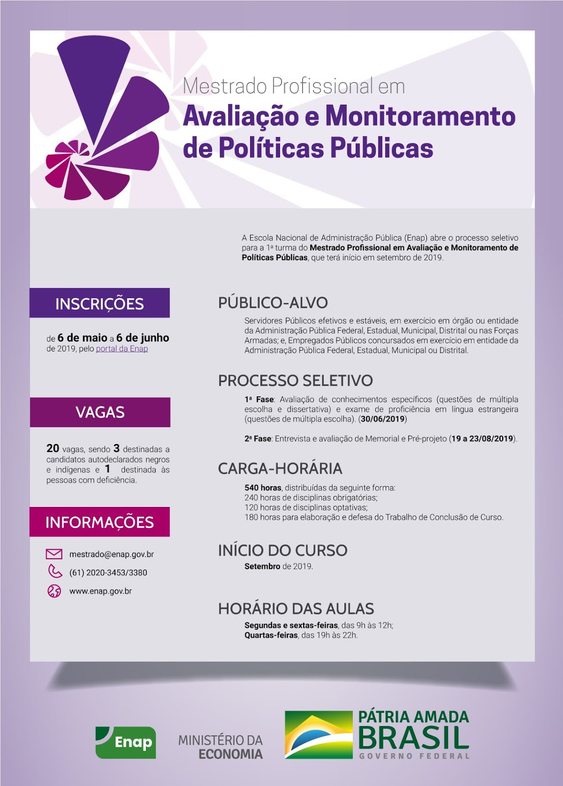A atuação efetiva do Estado na promoção de políticas públicas para o desenvolvimento e o bem-estar social exige, cada vez mais, a formação de gestores públicos com conhecimentos teóricos e metodológicos atualizados, bem como o domínio de técnicas e instrumentos que operacionalizam as políticas e programas governamentais. Com o propósito de atender a essa necessidade de formação e qualificação para a Administração Pública Brasileira, a Escola Nacional de Administração Pública (Enap) oferece a primeira turma do Mestrado Profissional em Avaliação e Monitoramento de Políticas Públicas. (Confira o edital de abertura).