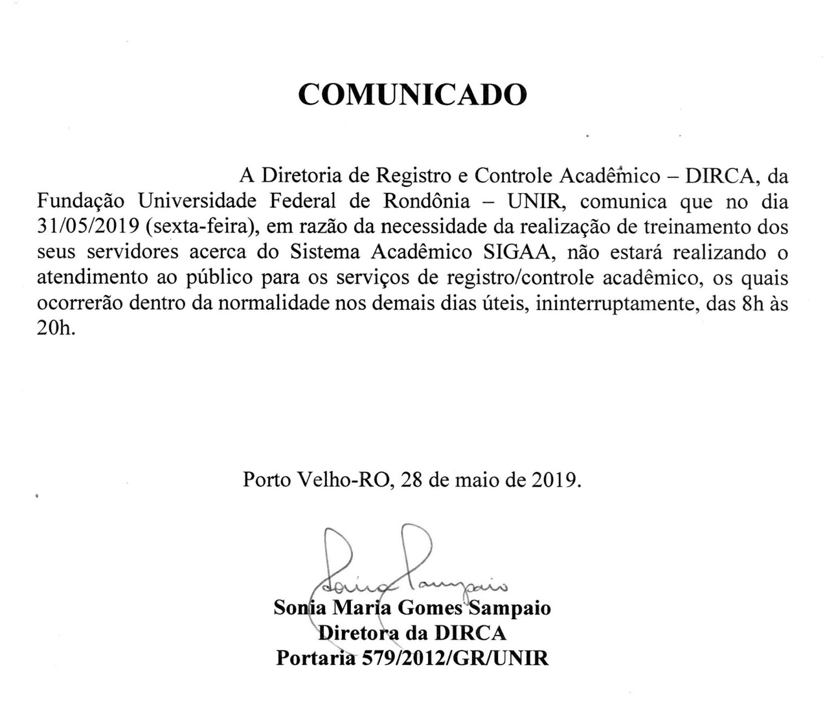 Comunicado da DIRCA sobre funcionamento interno no dia 31 de maio