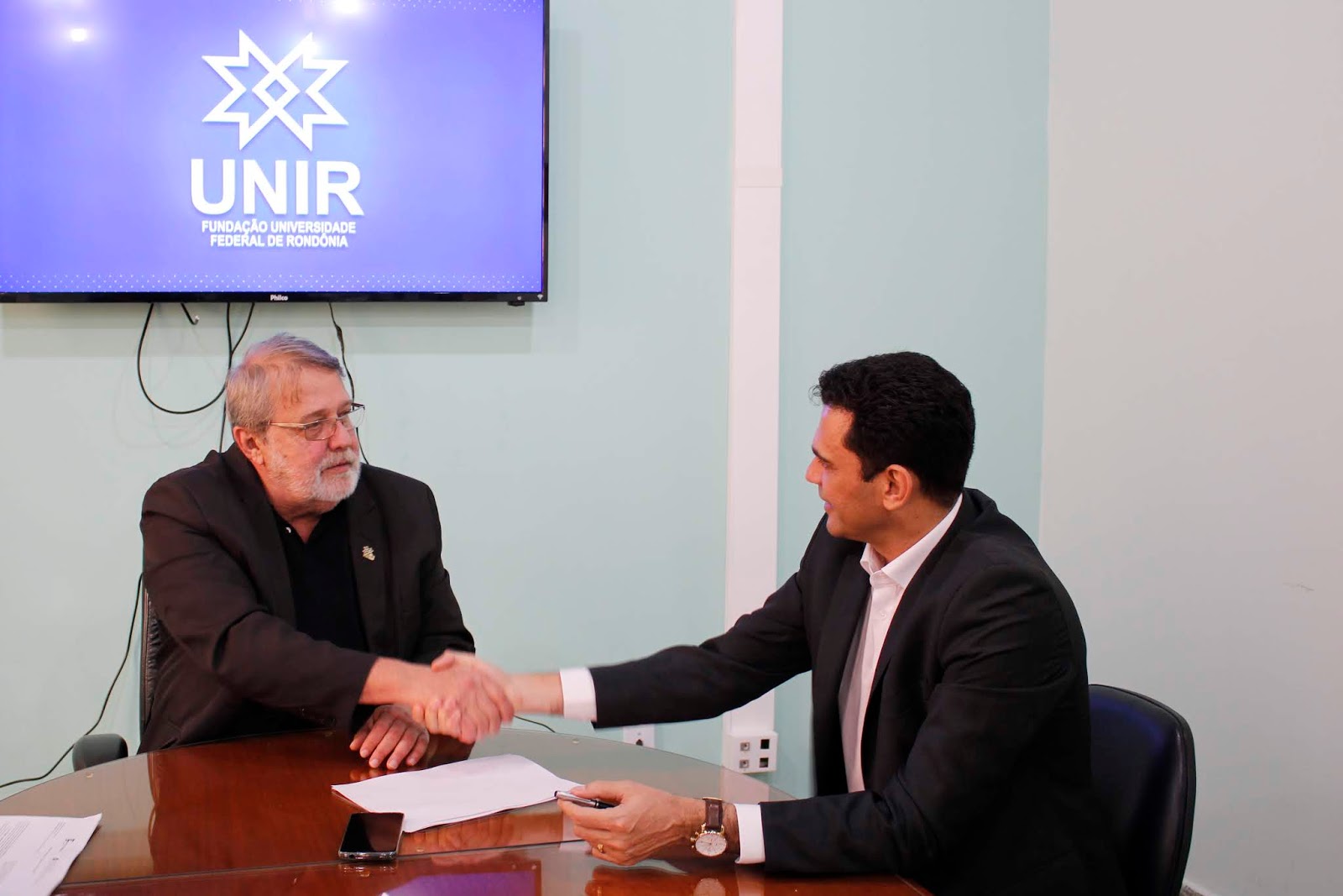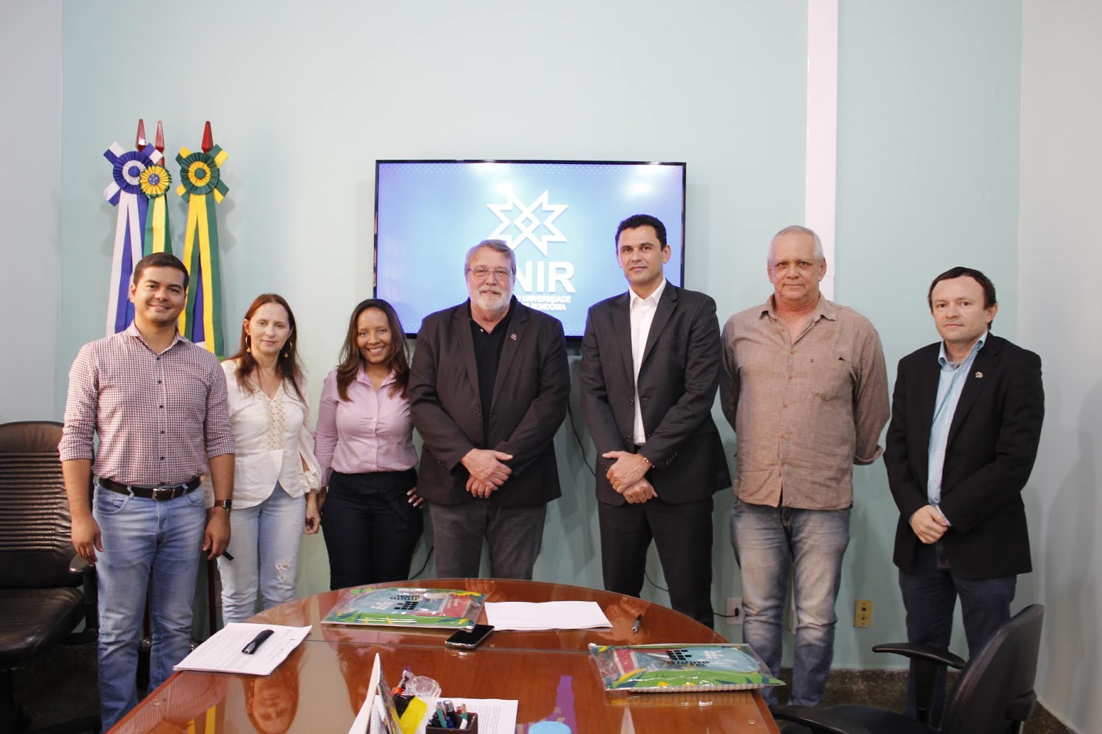 Na tarde desta segunda-feira, 17, reuniram-se os professores: Ari Miguel Teixeira Ott, Reitor da UNIR, Uberlando Tiburtino Leite, Reitor do IFRO, Carlos Luís Ferreira da Silva, Pró-Reitor de Pós-Graduação e Pesquisa da UNIR, Gilmar Alves Lima Júnior, Pró-Reitor de Pós-Graduação e Pesquisa do IFRO, Kátia Sebastiana Carvalho dos Santos Farias e Marlene Rodrigues, Coordenadora e Vice-Coordenadora respectivamente do Programa de Pós-graduação em Educação Escolar, Mestrado e Doutorado Profissional, para assinatura do Termo de Cooperação Técnico-científica celebrado entre o Instituto Federal de Educação, Ciência e Tecnologia de Rondônia (IFRO) e a Fundação Universidade Federal de Rondônia (UNIR).