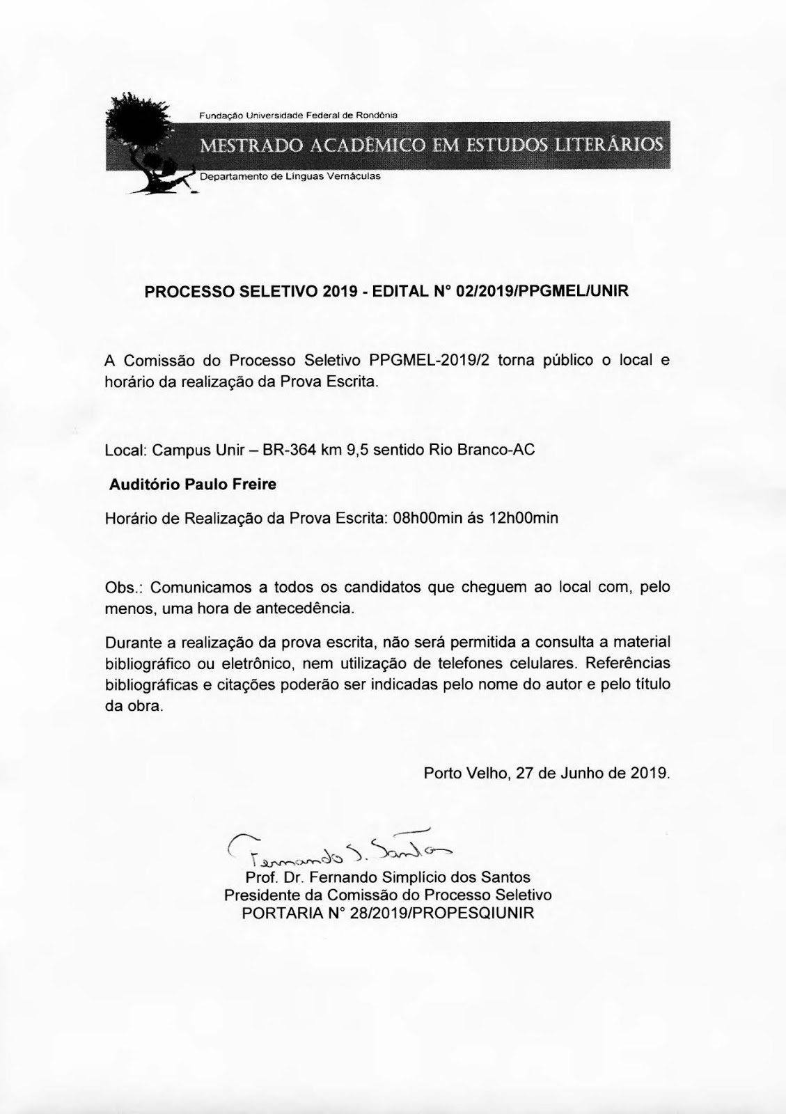 Edital nº 02/2019/PPGMEL/UNIR - Divulgados horário e local da prova escrita do processo seletivo para o Mestrado Acadêmico em Estudos Literários