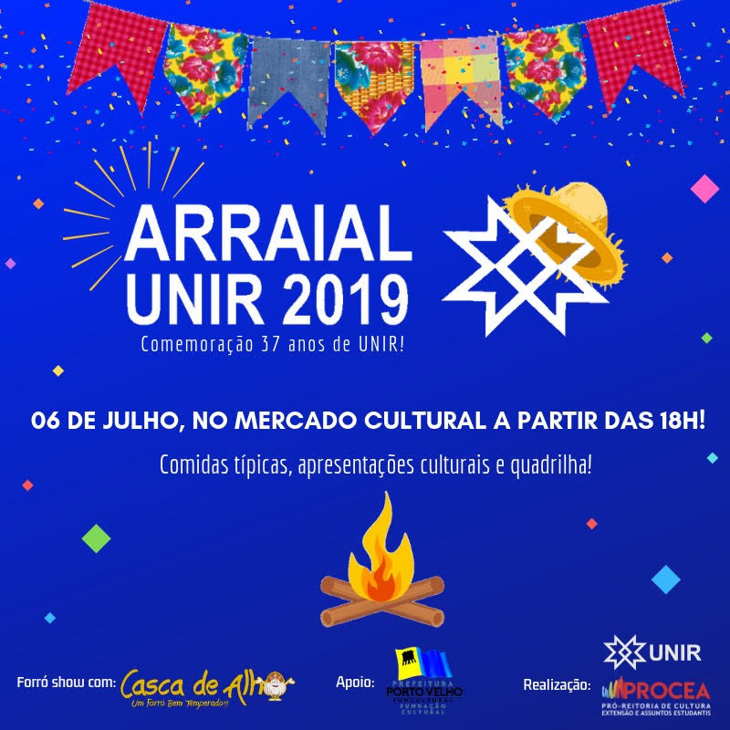 A Fundação Universidade Federal de Rondônia realizará neste sábado, 6 de julho, o Arraial UNIR 2019, quando também será comemorado o seu 37º aniversário. O evento será no Mercado Cultural, em Porto Velho, a partir das 19h, aberto à toda a comunidade acadêmica e sociedade de Porto Velho.