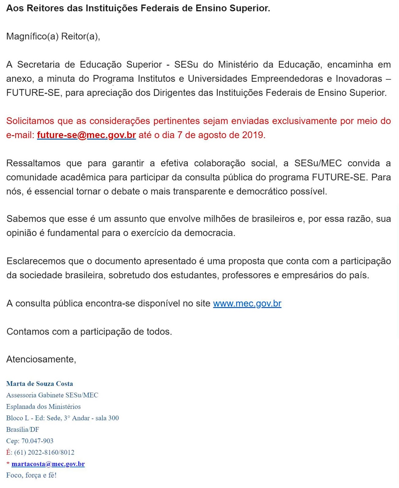 Na mensagem, disponível abaixo, a SESu/MEC convida a comunidade acadêmica para participar da consulta pública do programa FUTURE-SE, já disponível no site www.mec.gov.br e também no arquivo abaixo.