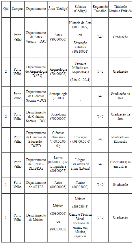 A diretora do Núcleo de Ciências Humanas (NCH) da Fundação Universidade Federal de Rondônia (UNIR), professora doutora Walterlina Barboza Brasil, no uso das suas atribuições, conferidas pela Portaria nº 225/2019/GR/UNIR e considerando os termos da Lei n.° 8.745/1993, combinados com a Lei n.° 12.772/2012, o Decreto nº 6.944/2009, a Instrução Normativa nº 06, de 15 de abril de 2019 da PRAD/UNIR e a Instrução Normativa nº 08, de 20 de maio de 2019 da PRAD/UNIR, torna pública a abertura das inscrições para o Processo Seletivo Simplificado visando à contratação de Professor Substituto, nos termos deste Edital.