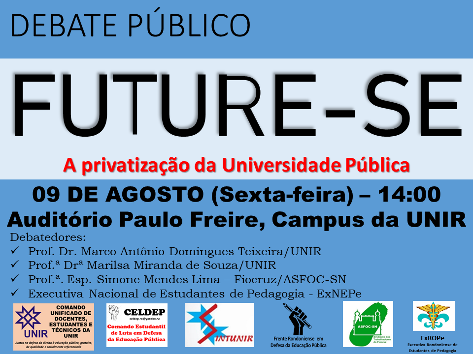 Neste sentido, toda a comunidade acadêmica e população em geral estão convidadas para debater o referido programa governamental. Os debatedores serão os professores Marco Antonio Domingues Teixeira, do Departamento de História/UNIR; Marilsa Miranda de Souza, do Departamento de Ciências da Educação/UNIR, a Enfermeira Simone Mendes, da ASFOC-SN/Fiocruz; juntamente com a representação da Executiva Nacional de Estudantes de Pedagogia (ExNEPe).