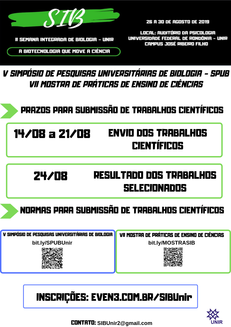 Submissões de trabalhos científicos para o V SPUB e para a VII Mostra de Práticas de Ensino de Ciências podem ser feitas pelo e-mail sibunir2@gmail.com e as inscrições no site https://www.even3.com.br/SIBunir/ , até o dia 21 de agosto. As normas para submissão de trabalhos científicos podem ser visualizadas por meio dos links bit.ly/MOSTRASIB e bit.ly/SPUBUnir .png)