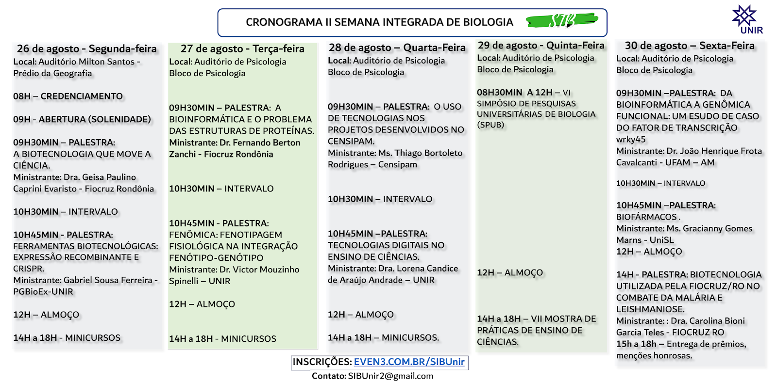 A Semana Integrada de Biologia (SIB) é um evento organizado anualmente por discentes e docentes de Ciências Biológicas da Fundação Universidade Federal de Rondônia (UNIR) com oobjetivo de oportunizar aos estudantes de graduação e pós-graduação uma formação complementar com conteúdos relacionados às áreas de atuação do profissional biólogo.