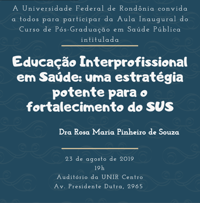 A Fundação Universidade Federal de Rondônia (UNIR), convida a comunidade acadêmica e sociedade em geral para a Aula Inaugural do Curso de Pós-Graduação em Saúde Pública, na qual será realizada a palestra intitulida: "Educação Interprofissional em Saúde: Uma Estratégia potente para o fortalecimento do SUS".