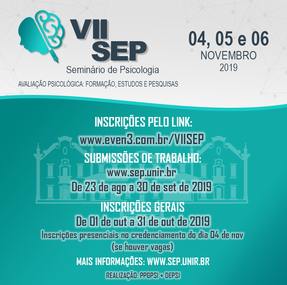 A Comissão Organizadora do VII Seminário de Psicologia (SEP), do Programa de Pós-Graduação em Psicologia da Fundação Universidade Federal de Rondônia (UNIR), torna público o período de inscrição para submissão de trabalhos (Comunicação oral). As submissões de trabalhos podem ser feitas desta sexta-feira, 23, até o dia 30 de setembro. Com relação às inscrições para participação geral no evento o período efetivação será de 1º a 31 de outubro de 2019.