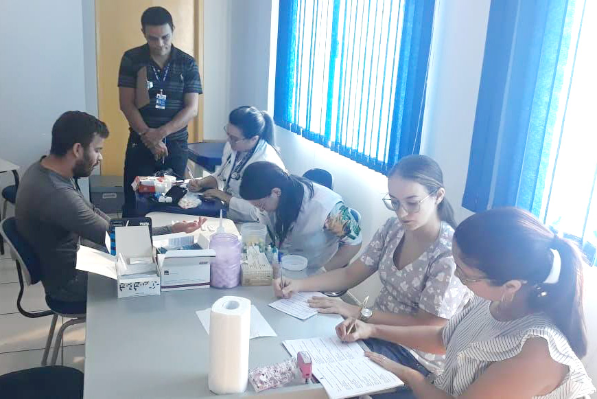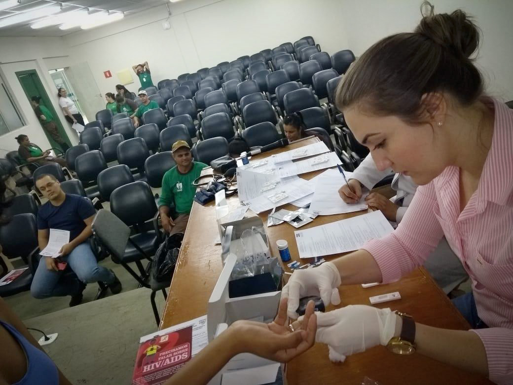 Servidores, estudantes e colabores terceirizados participaram de testagem rápida para HIV, sífilis e hepatites B e C, além de aferição de glicemia capilar, pressão arterial e orientações para preservação da saúde. As ações estiveram a cargo da enfermeira Sayane Marlla Silva Leite Montenegro e do psicólogo Henrique Moreira, que contaram com o apoio do Centro de Referência em Saúde do Trabalhador (CEREST).