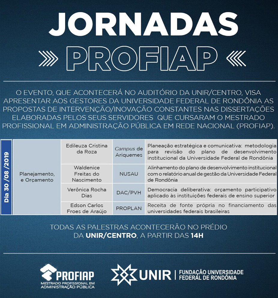 Nesta sexta-feira, 30 de agosto, a partir das 14h, no auditório da Fundação Universidade Federal de Rondônia (UNIR), no centro de Porto Velho, acontece a segunda etapa do evento Jornadas PROFIAP. Serão apresentadas quatro propostas de intervenção/inovação constantes nas dissertações elaboradas pelos servidores da Instituição que cursaram o Mestrado Profissional em Administração Pública em Rede Nacional (PROFIAP), visando trazer melhorias para a Universidade; bem como discutir temas relevantes à UNIR, provocando debates e o surgimento de novas ideias e contribuindo para aumentar a produtividade e a efetividade na Instituição.