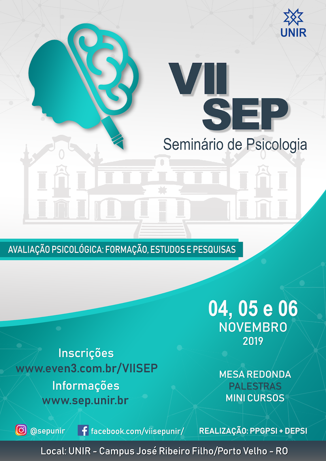 O Programa de Pós-Graduação em Psicologia e o curso de Graduação em Psicologia da Fundação Universidade Federal de Rondônia (UNIR) convidam acadêmicos e a sociedade em geral para a 7ª edição do Seminário de Psicologia (SEP). O evento está programado para o período de 4 a 6 de novembro, no campus da UNIR em Porto Velho, localizado na BR 364, KM 9,5, sentido Acre.