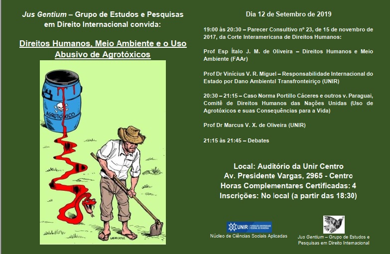 O Grupo de Estudos e Pesquisas em Direito Internacional (Jus Gentium) da Fundação Universidade Federal de Rondônia realizará nessa quinta-feira (12), a partir das 19h, no auditório da UNIR/Centro, a apresentação e discussão de temas referentes a Direitos Humanos, Meio Ambiente e o Uso Abusivo de Agrotóxicos.