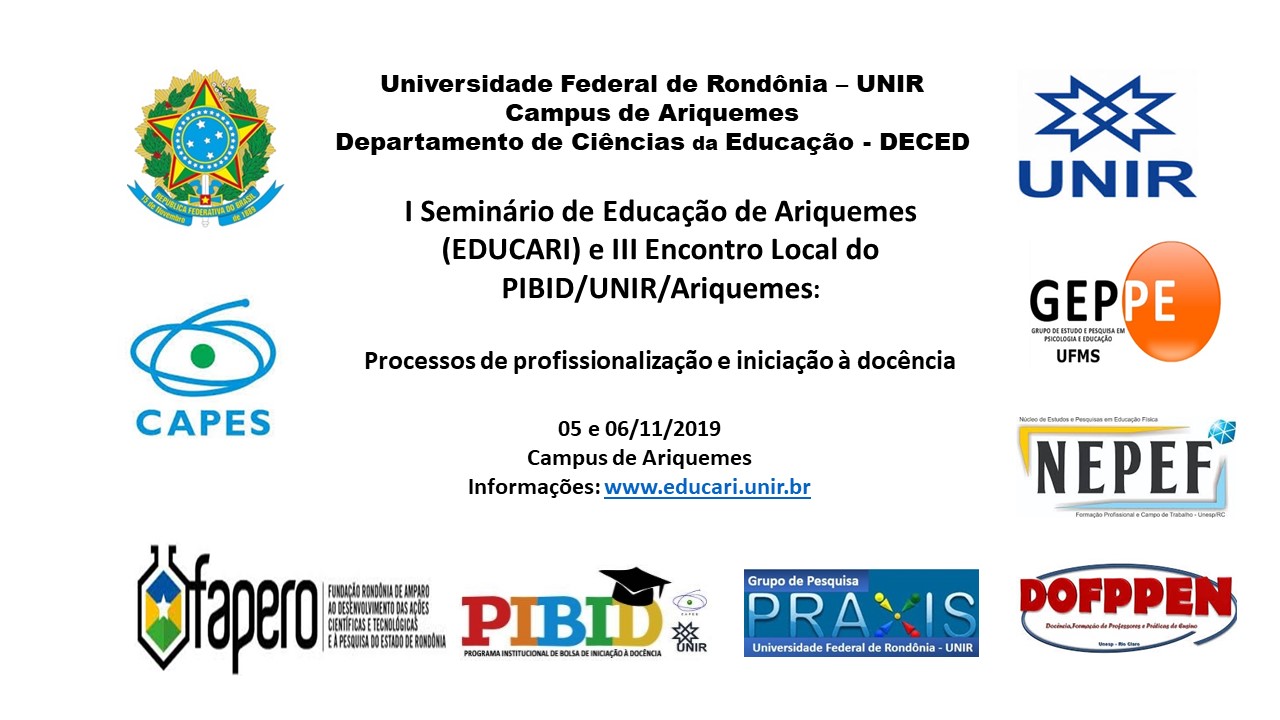 Nos dias 05 e 06 de novembro o campus de Ariquemes da Fundação Universidade Federal de Rondônia (UNIR) sediará o I Seminário de Educação de Ariquemes (EDUCARI) e III o Encontro Local do Programa Institucional de Bolsa de Iniciação à Docência (PIBID). O evento será aberto às comunidades interna e externa porém, limitado ao número de vagas disponíveis e, nesta edição, terá como proposta a discussão do tema “Processos de profissionalização e iniciação à docência” e será.