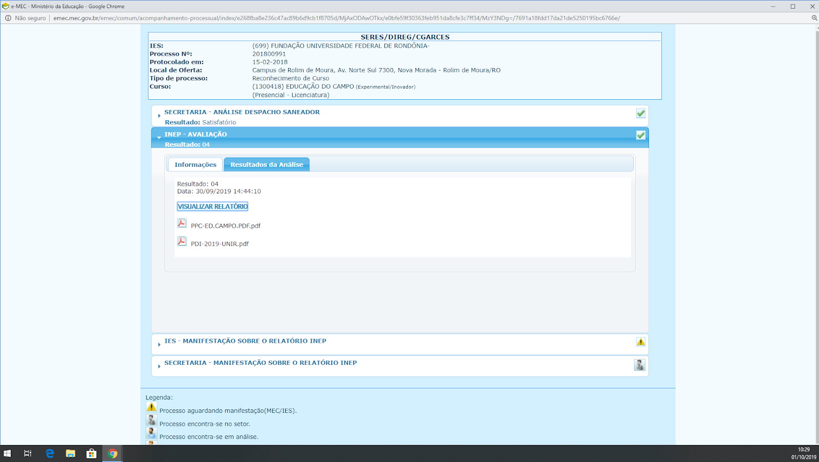 Durante o período de 22 a 25 de setembro, o curso de Educação do Campo, do campus de Rolim de Moura da Fundação Universidade Federal de Rondônia (UNIR)passou pela Avaliação de Cursos de Graduação Presencial realizada pelo Instituto Nacional de Estudos e Pesquisas Educacionais (Inep), um ato regulatório para fins de reconhecimento do curso.