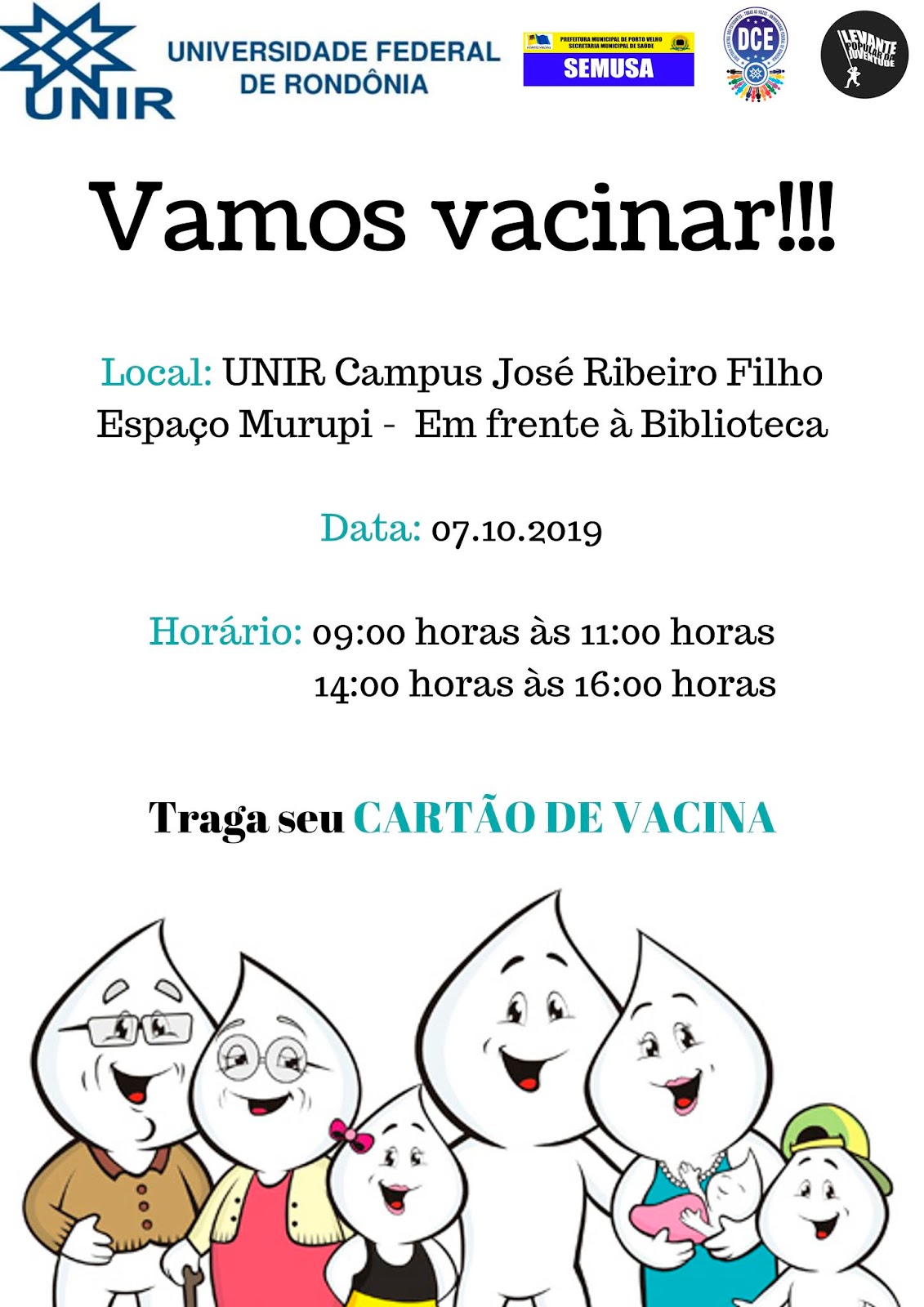 A Pró-Reitoria de Adminstração (PRAD) da Fundação Universidade Federal de Rondônia (UNIR), por meio da Diretoria de Gestão de Pessoas (DAP), informa a toda comunidade acadêmica que estará desenvolvendo ação de imunização de servidores, estudantes, terceirizados e colaboradores, público circulante na UNIR, em parceria com a Secretaria Municipal de Saúde do Município de Porto Velho (SEMUSA), no dia 7 de outubro de 2019, no campus José Ribeiro Filho.