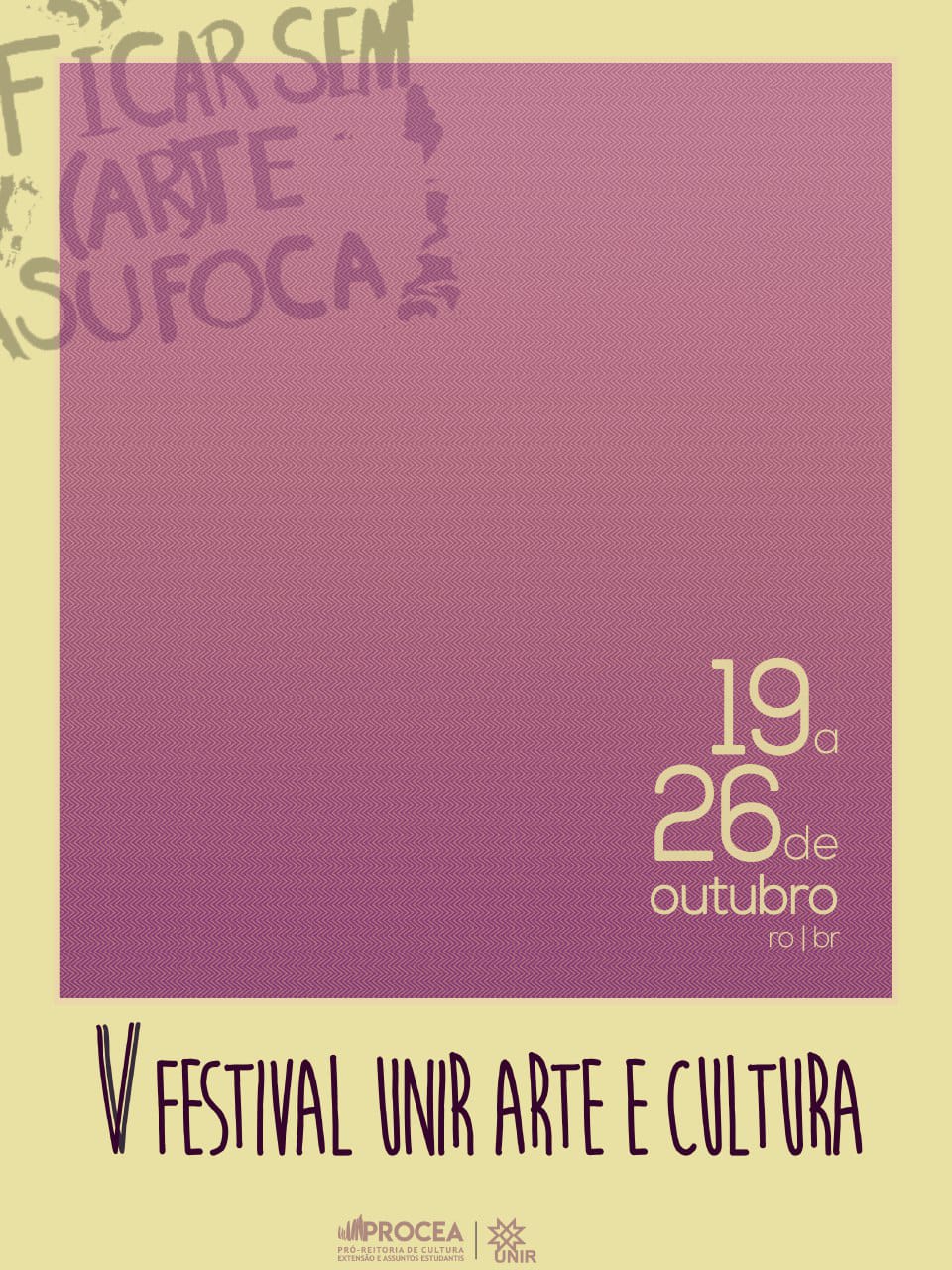 A Fundação Universidade Federal de Rondônia, por meio da Pró-Reitoria de Cultura, Extensão e Assuntos Estudantis (Procea), convida a comunidade acadêmica e externa para participar do V Festival UNIR Arte e Cultura que acontecerá no período de 19 a 26 de outubro, com atividades a partir das 8h, no campus José Ribeiro Filho e em outros espaços culturais dos campi da UNIR na capital e no interior de Rondônia