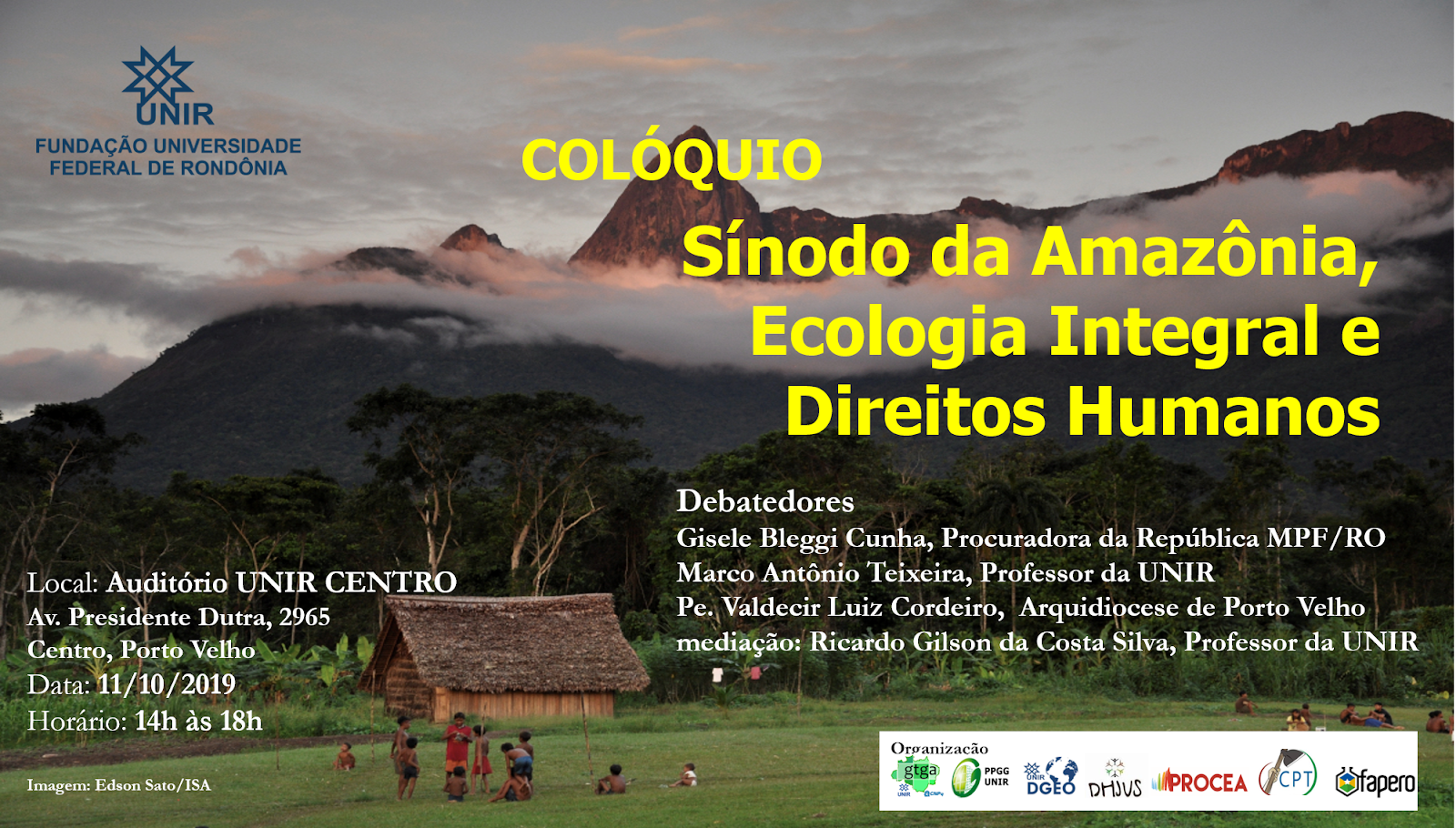 O Departamento de Geografia (DGEO), o Programa de Pós-graduação em Geografia (PPGG), o Programa de Pós-graduação em Direitos Humanos e Desenvolvimento da Justiça (DHJUS) e o Grupo de Pesquisa em Gestão do Território e Geografia Agrária de Rondônia (GTGA) da Fundação Universidade Federal de Rondônia, convidam a sociedade para o Colóquio: Sínodo da Amazônia, Ecologia Integral e Direitos Humanos”, que será realizado nessa sexta-feira (11), no período das 14h às 18h, no auditório da UNIR/Centro.