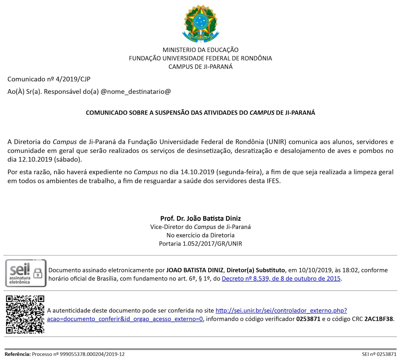 Comunicado sobre a suspensão das atividades do campus de Ji-Paraná