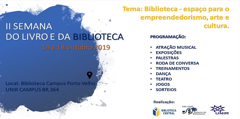 Com o tema “Biblioteca: espaço para o empreendedorismo, arte e cultura”, a programação da II Semana do Livro e da Biblioteca da UNIR viabilizará acesso a cursos, palestras, exposições, rodas de conversa com autores regionais, dança, jogos, apresentação teatral e sorteios.