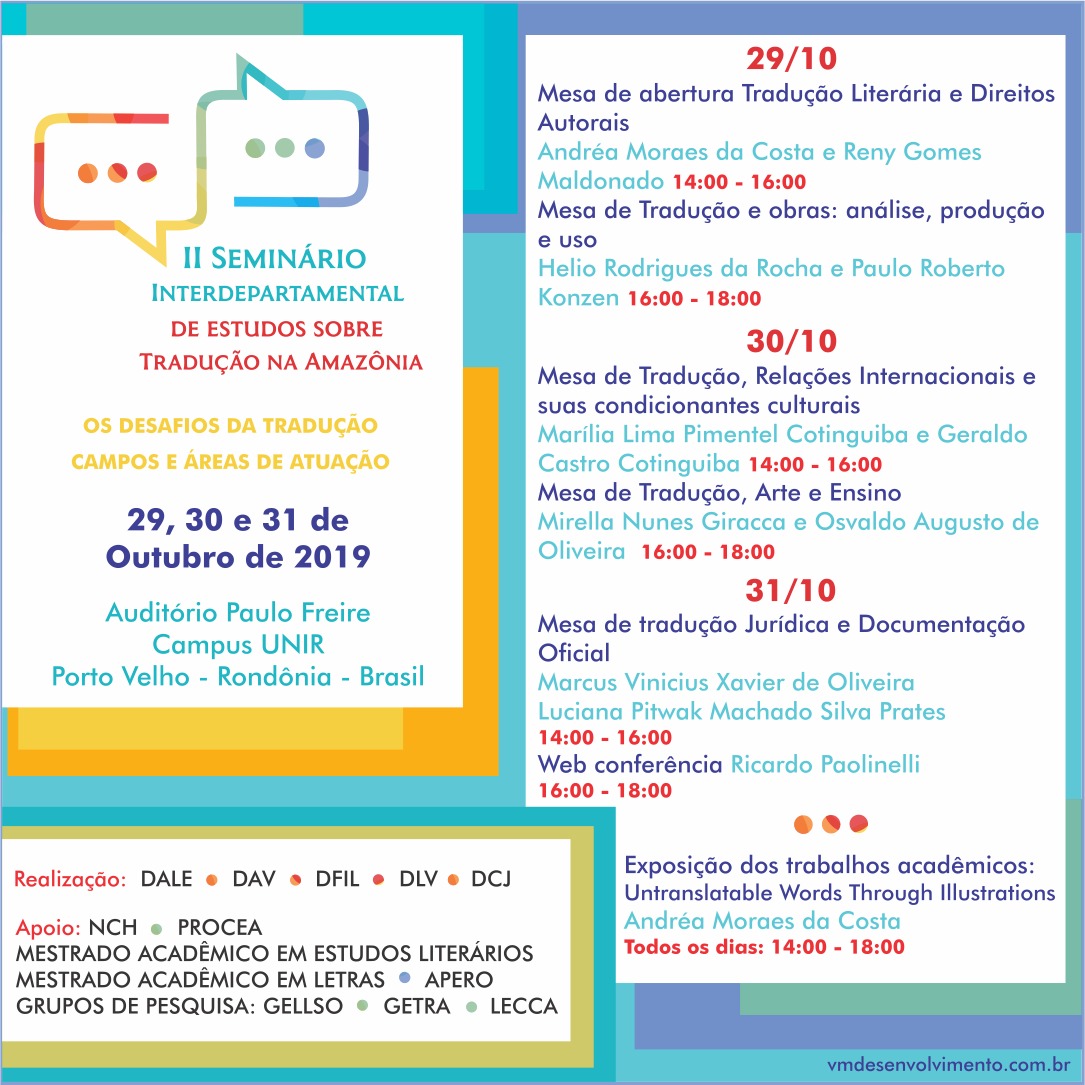 Para acessar a programação completa do II Seminário Interdepartamental de Estudos sobre Tradução na Amazônia e se inscrever no evento, basta clicar aqui