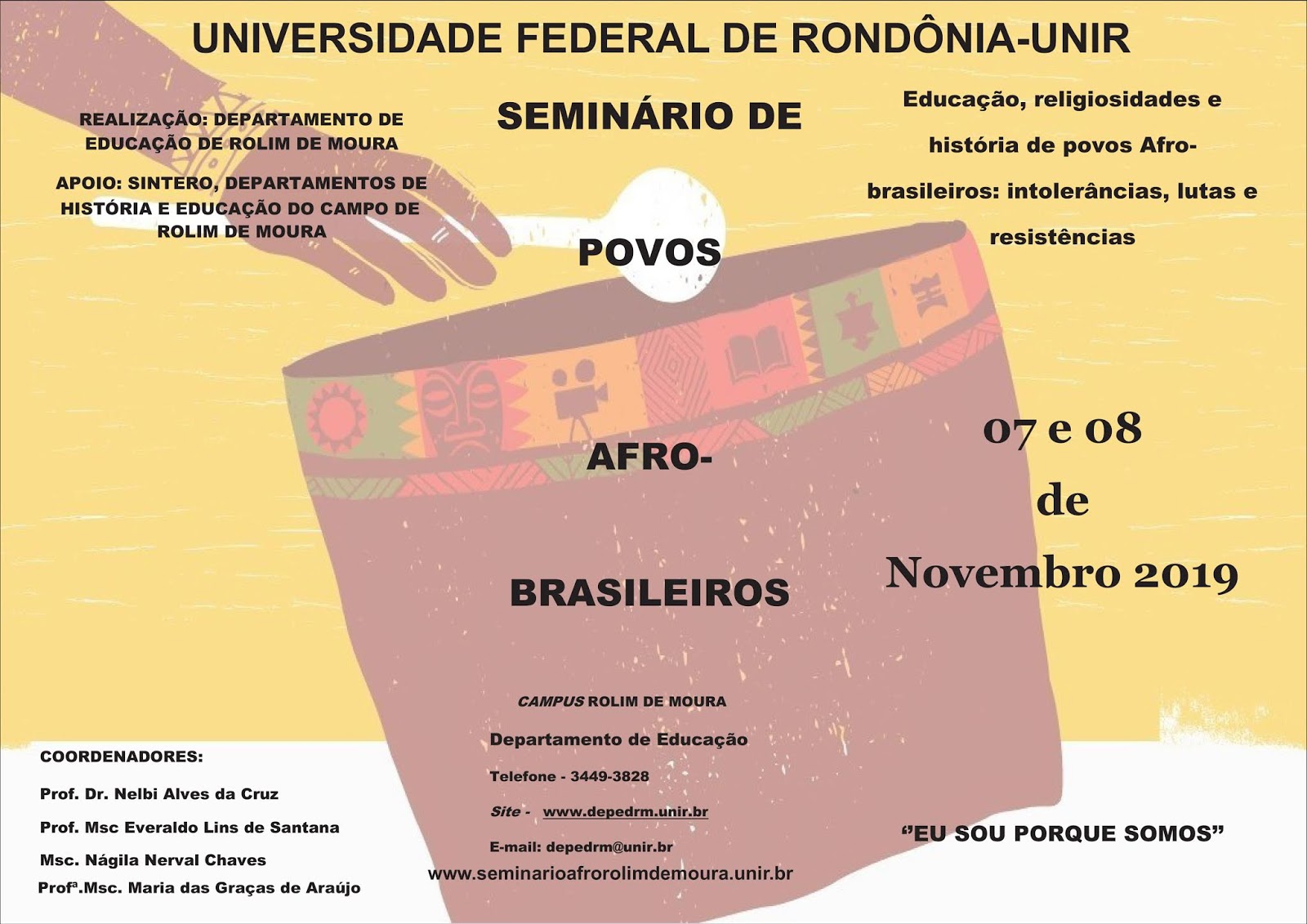 O Seminário de Povos Afro-brasileiros terá como objetivos a difusão de conhecimentos sobre educação, cultura, memórias de afro-brasileiros; caracterização de intolerância; educação e cultura afro-brasileira e a colonialidade existente nesses aspectos; analisar as histórias e memórias dos negros idosos e suas contribuições na construção do município de Rolim de Moura; refletir sobre a religiosidade afro-brasileira e sua influência na cultura local e nacional; e, promover uma roda de conversa entre os praticantes da cultura afro- brasileira de Rolim de Moura, discutindo o seu processo de colonialidade do saber.