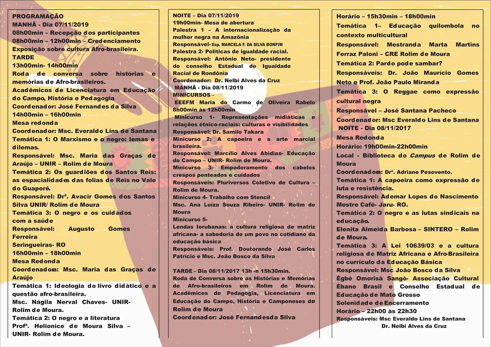 Para acessar a programação completa do Seminário de Povos Afro-brasileiros de Rolim de Moura e o espaço de inscrições basta clicar no link www.seminarioafrorolimdemoura.unir.br .