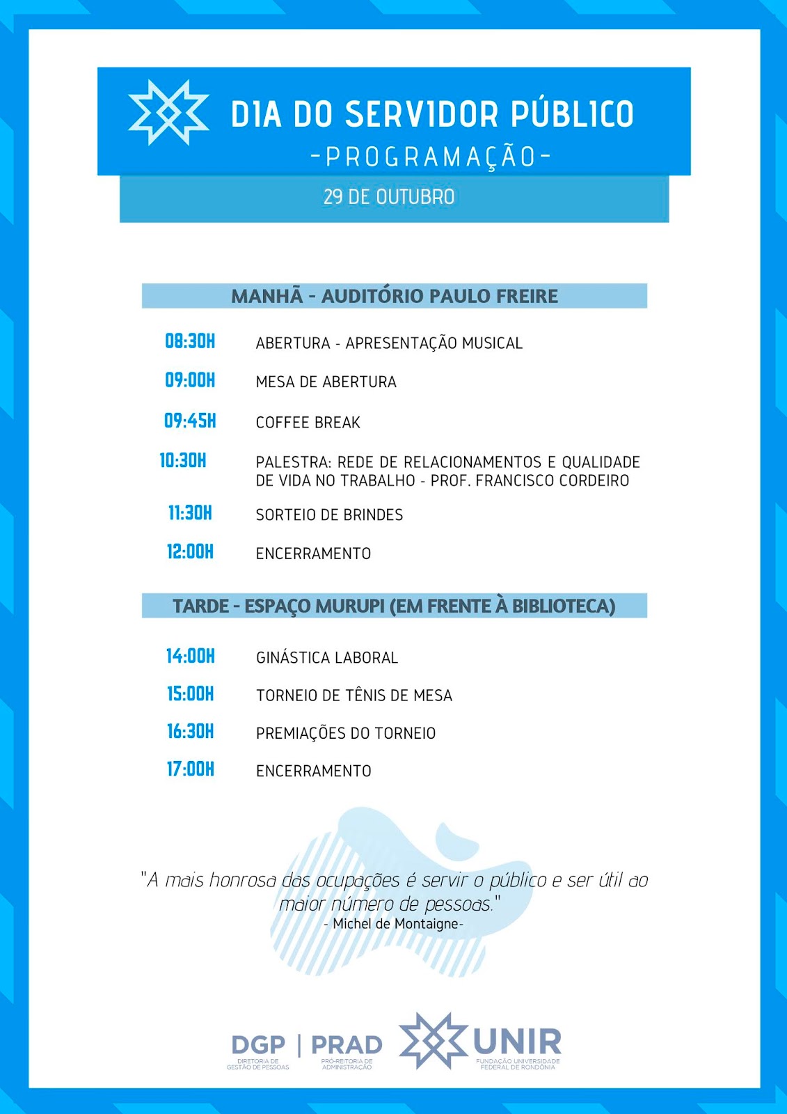 A Reitoria da Fundação Universidade Federal de Rondônia (UNIR) comunica aos servidores e à comunidade em geral que, tomando por base o disposto na Portaria Ministério do Planejamento, Desenvolvimento e Gestão(MPOG) nº 442, de 28 de dezembro de 2018, a data de 28 de outubro de 2019 (segunda-feira) será ponto facultativo, em alusão ao Dia do Servidor Público.