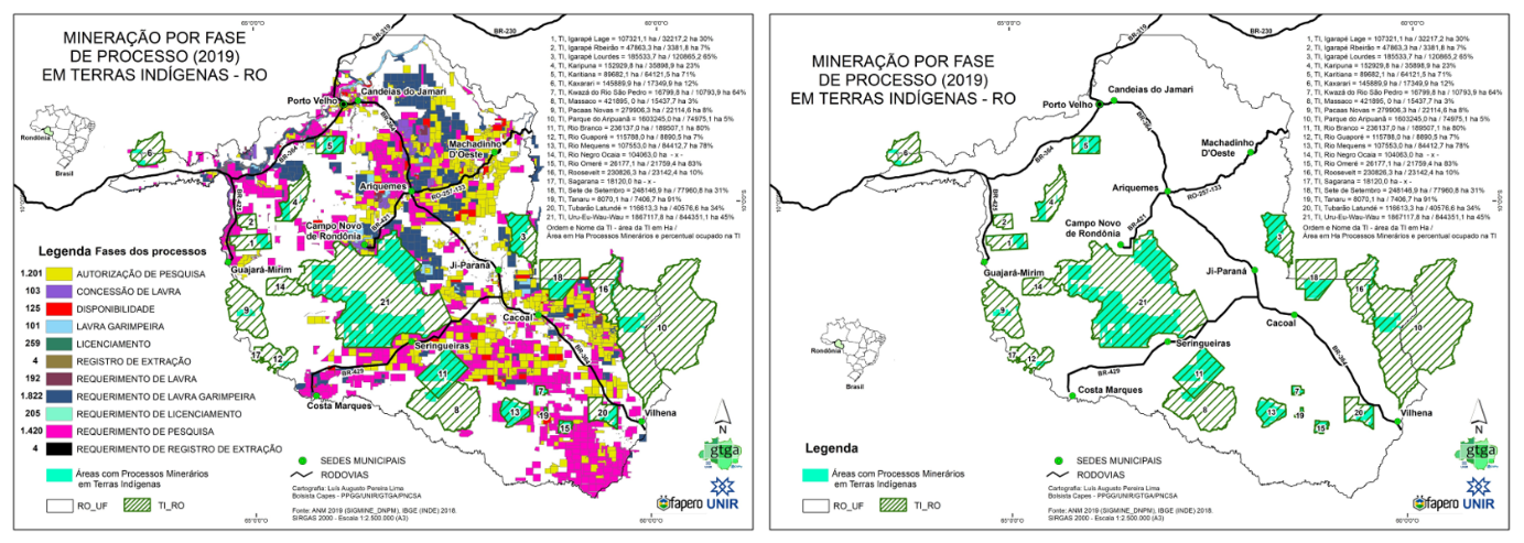 Durante a programação do evento, o professor doutor Ricardo Gilson da Costa Silva, coordenador do Grupo Gestão do Território e Geografia Agrária da Amazônia (GTGA), apresentou os resultados parciais do estudo “Cartografia da Mineração em Terras Indígenas de Rondônia”, bem como mapas e dados preliminares dos impactos territoriais da proposta de mineração em áreas indígenas.
