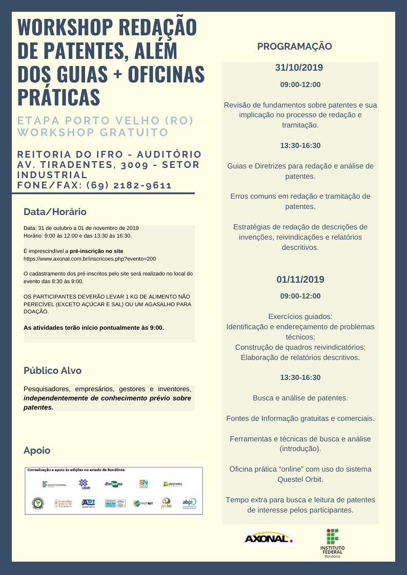 O Workshop básico/intermediário, promovido pela Axonal conjuntamente com diversas organizações do ecossistema de empreendedorismo e inovação, acontecerá nos dias 31 de Outubro e 1º de novembro, das 8h30 às 16h30, no auditório da reitoria do Instituto Federal de Educação, Ciência e Tecnologia de Rondônia (IFRO), localizado na avenida Tiradentes Nº 3009, no Setor Industrial de Porto Velho e contará com a presença do ministrante, Henry Suziki, sócio diretor da Axonal Consultoria Tecnológica, consultor colaborador da Questel Consulting (FR).
