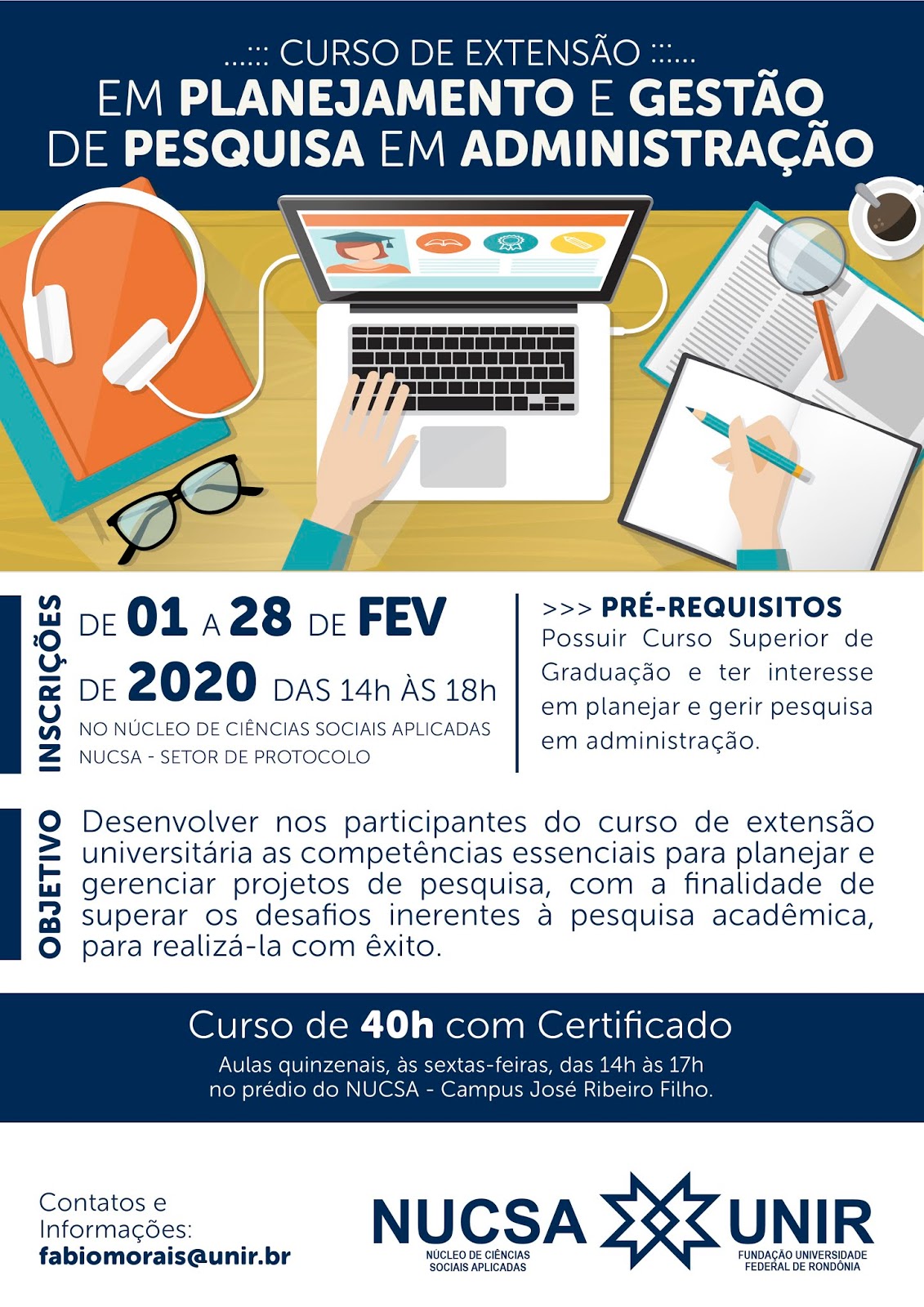 As inscrições para o Curso de Extensão em Planejamento e Gestão de Pesquisa em Administração – Turma II, promovido pelo Departamento de Administração do campus de Porto Velho da Fundação Universidade Federal de Rondônia (UNIR) estão abertas.
