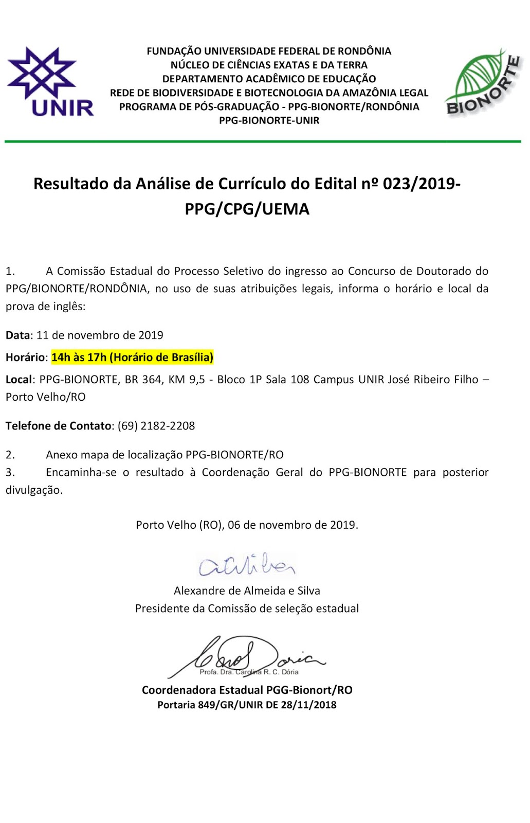 Comissão Estadual do Processo Seletivo para ingresso no Doutorado do PPG/BIONORTE/RONDÔNIA torna públicos o Local e Horário da Prova de Inglês