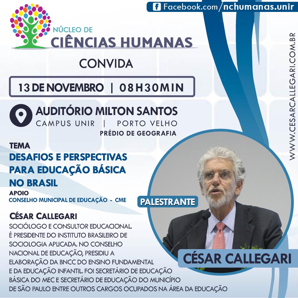 O Núcleo de Ciências Humanas (NCH) da Fundação Universidade Federal de Rondônia (UNIR) receberá o Sociólogo e Consultor Educacional Doutor César Callgari para uma palestra sobre o tema "Desafios e Perspectivas para Educação Básica no Brasil".