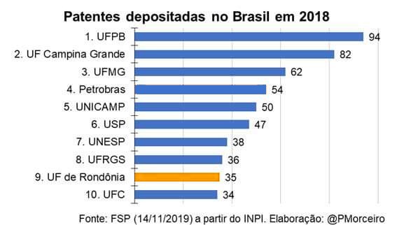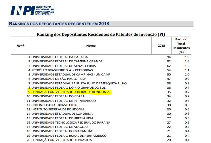 A Fundação Universidade Federal de Rondônia (UNIR) alcançou o 9° lugar do Brasil em ranking dos Depositantes Residentes de Patentes de Invenção (PI) no ano de 2018, totalizando 35 pedidos, de acordo com informações da Assessoria de Assuntos Econômicos do Instituto Nacional da Propriedade Industrial (INPI).