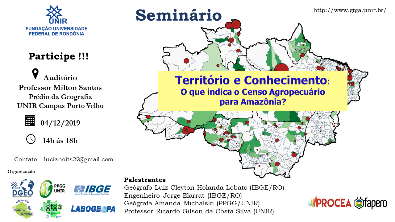O Departamento de Geografia (DGEO) e o Programa de Pós-graduação em Geografia (PPGG), da Fundação Universidade Federal de Rondônia (UNIR), convidam a todos para o Seminário “Território e Conhecimento: o que indica o Censo Agropecuário para Amazônia?”. O evento será realizado no dia 04 de dezembro, das 14h às 18h, no auditório Professor Milton Santos, no campus de Porto Velho.