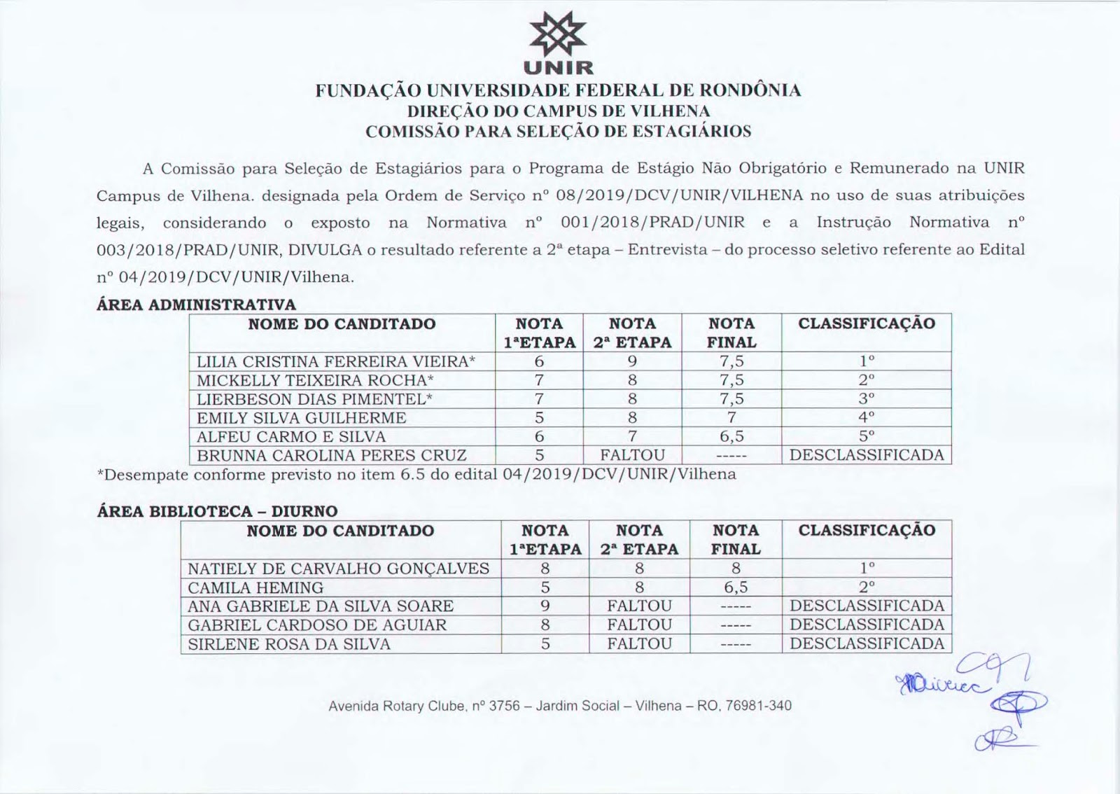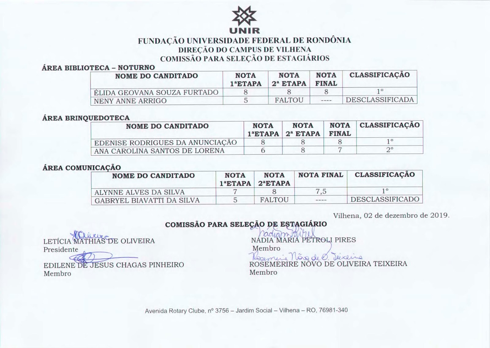 Campus de Vilhena divulga resultado final do edital nº 04/DCV/UNIR/Vilhena