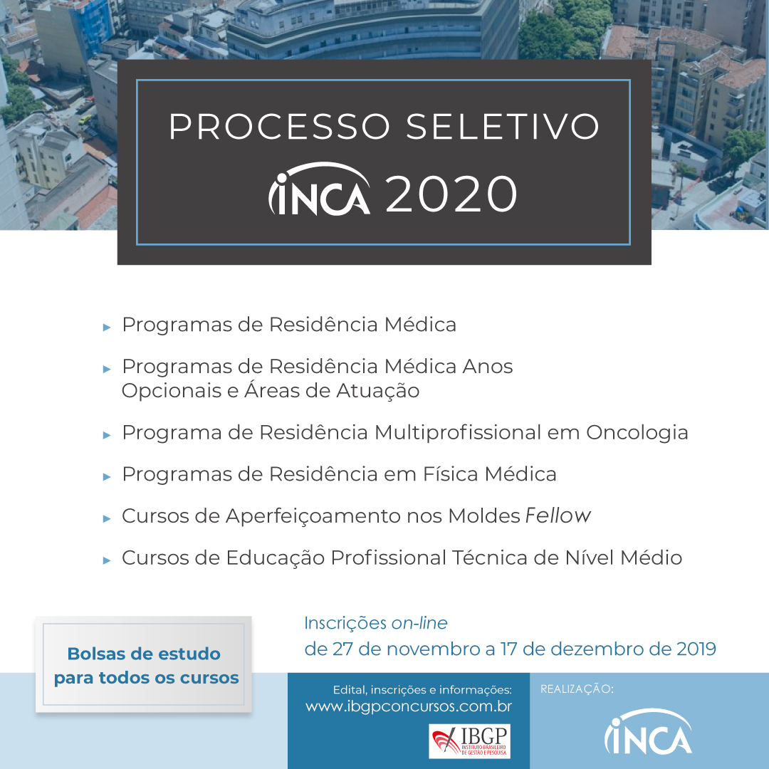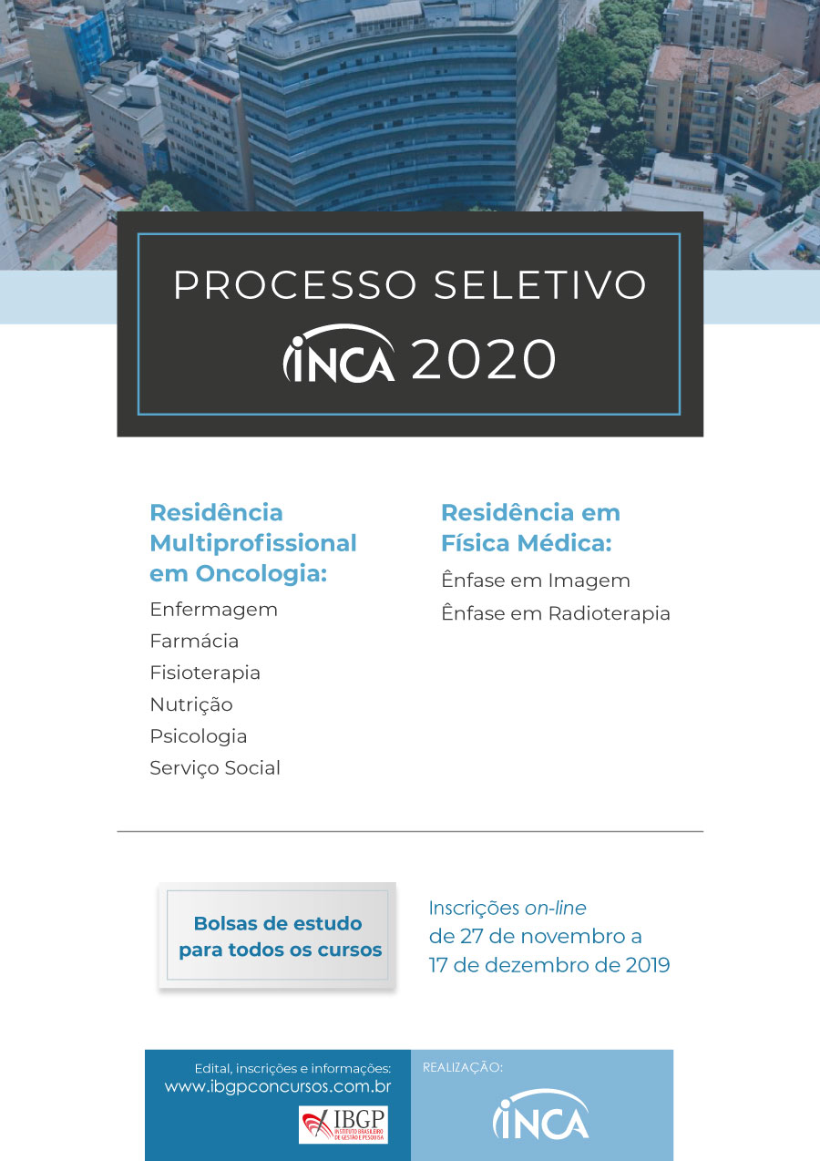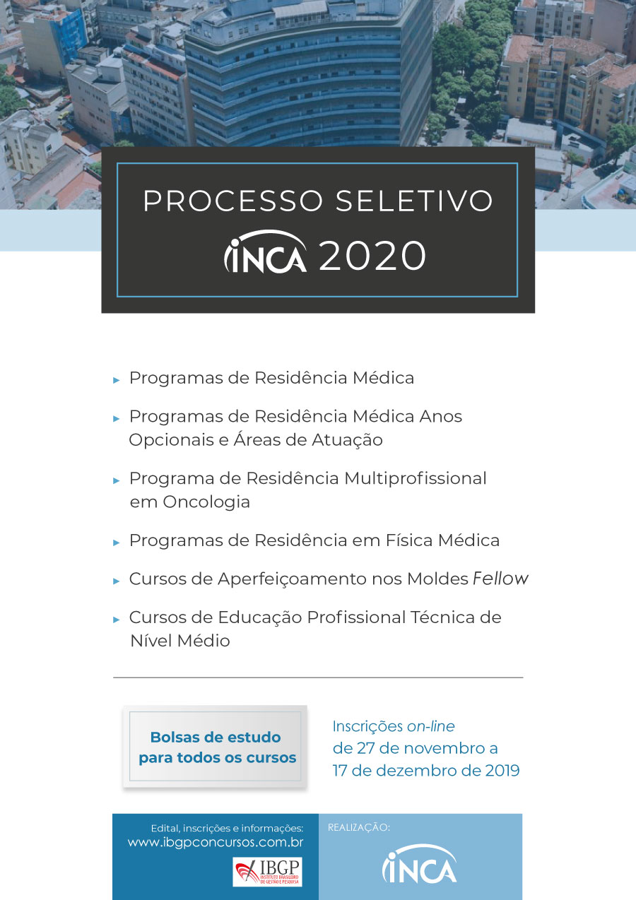 O IBGP possui notória experiência na realização de processos de seleção para a área da saúde, dentre outros produtos e serviços ofertados, razão pela qual torna públicos, a quem tenha interesse, os processos seletivos do INCA, conforme informações apresentadas nos flyer's a seguir.