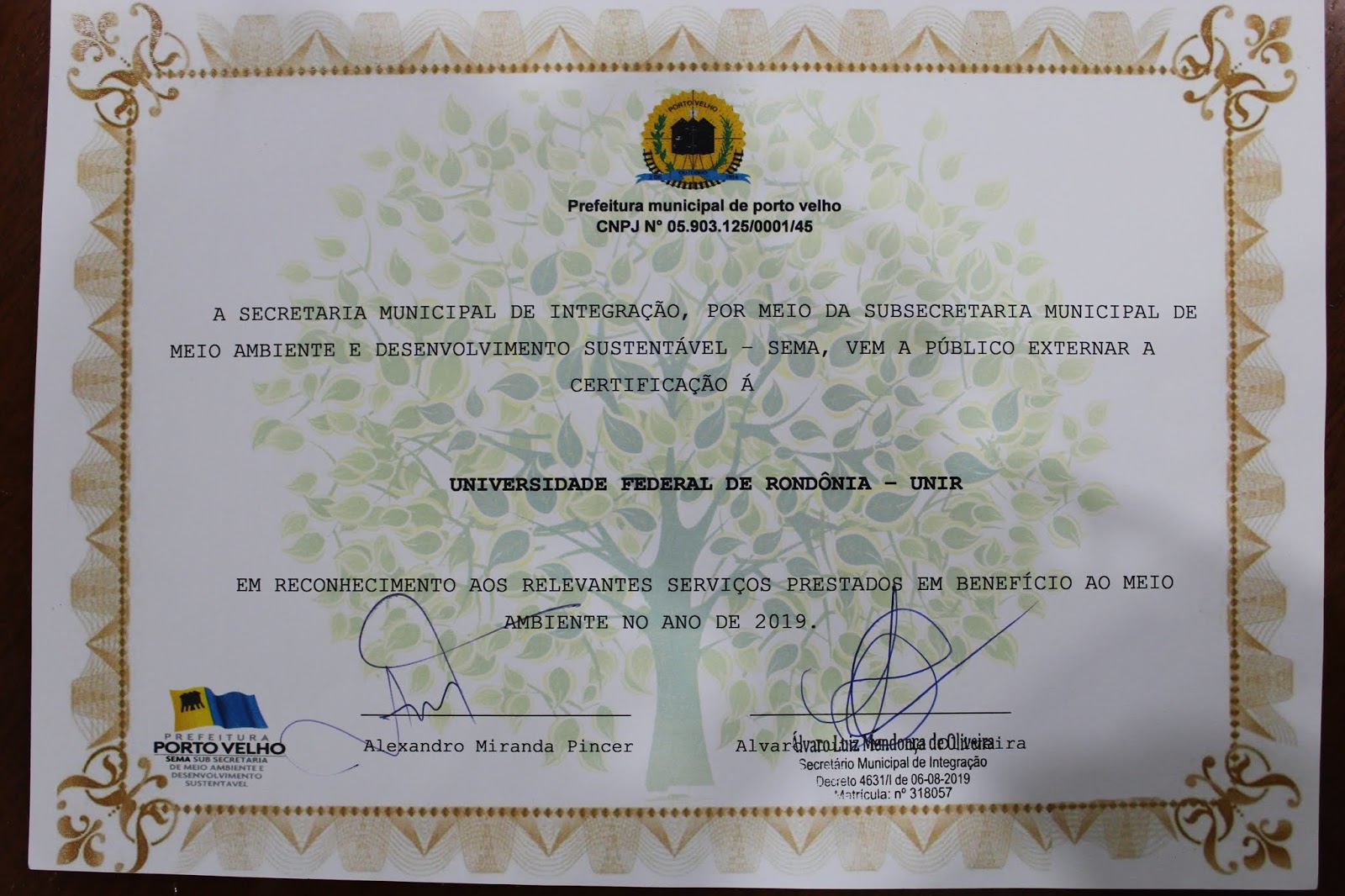 A Fundação Universidade Federal de Rondônia (UNIR) recebeu, do secretário Álvaro Luiz Mendonça de Oliveira, da Secretaria Municipal de Integração de Porto Velho (SEMI) e do subsecretário Alexandro Miranda Pincer, da Subsecretaria Municipal do Meio Ambiente e Desenvolvimento Sustentável (SEMA), o certificado de reconhecimento aos relevantes serviços prestados em benefício ao meio ambiente no ano de 2019.