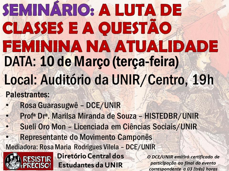 O Diretório Central dos Estudantes (DCE), da Fundação Universidade Federal de Rondônia (UNIR), realizará na próxima terça-feira, 10, a partir da 19h, no Auditório da UNIR/Centro, o Seminário intitulado “A LUTA DE CLASSES E A QUESTÃO FEMININA NA ATUALIDADE”. O evento propõe debater e denunciar a violência cotidiana contra as mulheres no campo, os processos de resistência das mulheres no campo e na cidade, além de celebrar o 8 de março como data histórica do dia internacional da mulher proletária. O formato do evento é de mesa de debate com mulheres indígenas, camponesa e estudantes, além de pesquisadores que abordam a temática. Após a exposição inicial haverá espaço para perguntas, intervenções e debate. Os organizadores do evento emitirão certificado de participação aos presentes ao final da atividade.