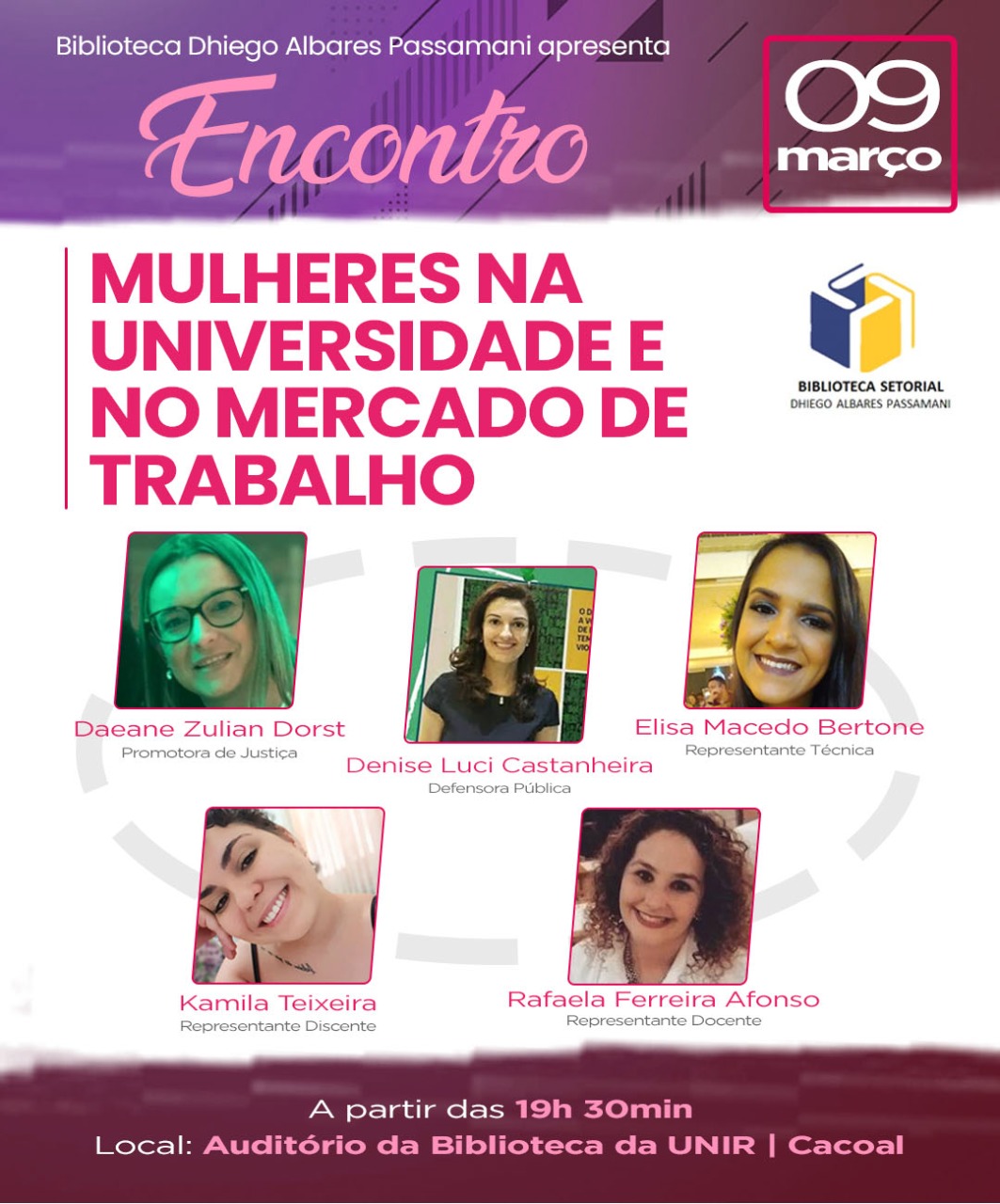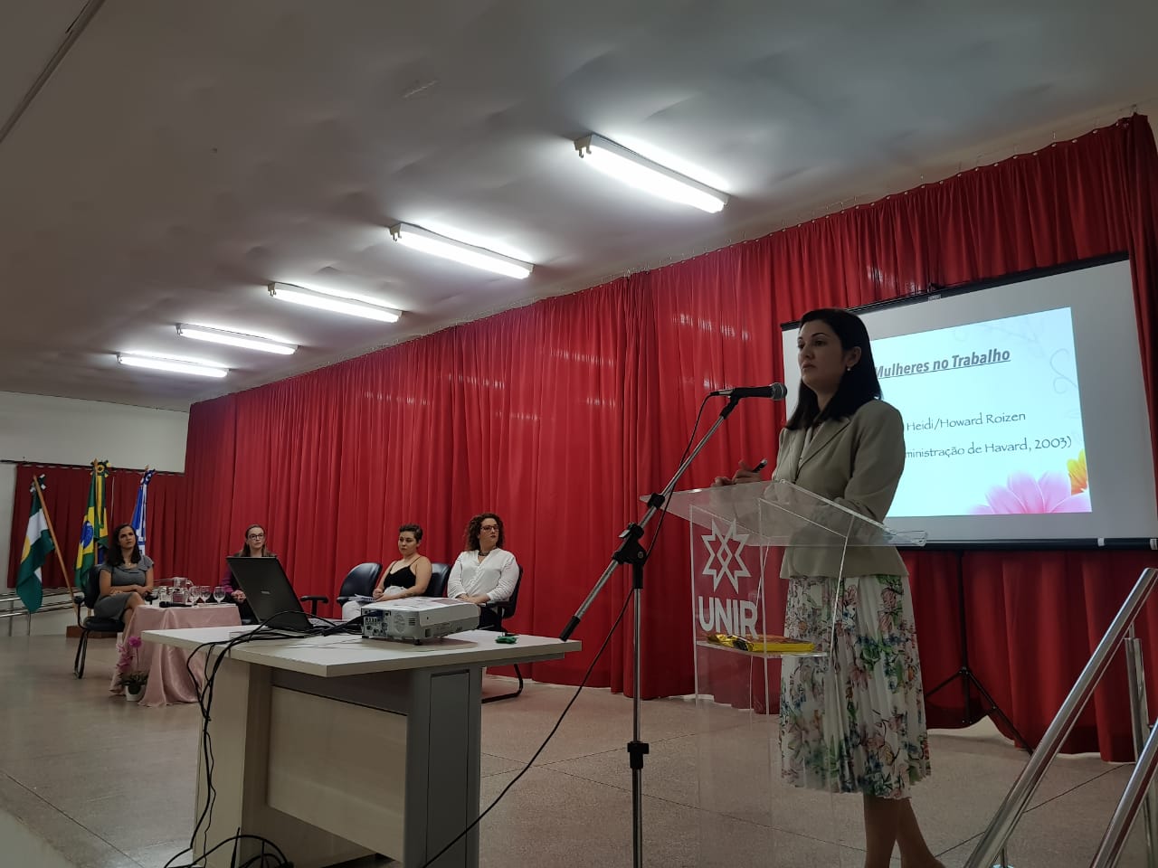 A Defensora Pública do Estado de Rondônia, Denise Luci Castanheira iniciou o evento com a palestra "Mulheres no trabalho", abordando o aspecto jurídico do tema. Também articiparam a Promotora de Justiça do Estado de Rondônia, Daeane Zulian Dorst, bem como representantes da UNIR, a servidora técnica-administrativa Elisa Macedo Bertone, a discente do 7º período de Direito, Kamila Teixeira e a docente do Departamento de Engenharia de Produção, Rafaela Afonso, que apresentaram dados sobre o assunto e relataram suas experiências.