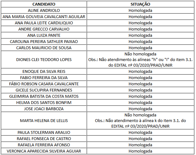 O Pró-Reitor de administração da Fundação Universidade Federal de Rondônia (UNIR) no uso de suas atribuições e, em atendimento ao que preconiza o cronograma do Edital nº 03/2020/PRAD/UNIR, torna público o resultado da análise das inscrições recebidas e as homologações para solicitação de concessão de afastamento aos servidores docentes e técnico-administrativos do quadro efetivo da UNIR, para realização de cursos de Mestrado, Doutorado e Pós-Doutorado, no segundo semestre de 2020.