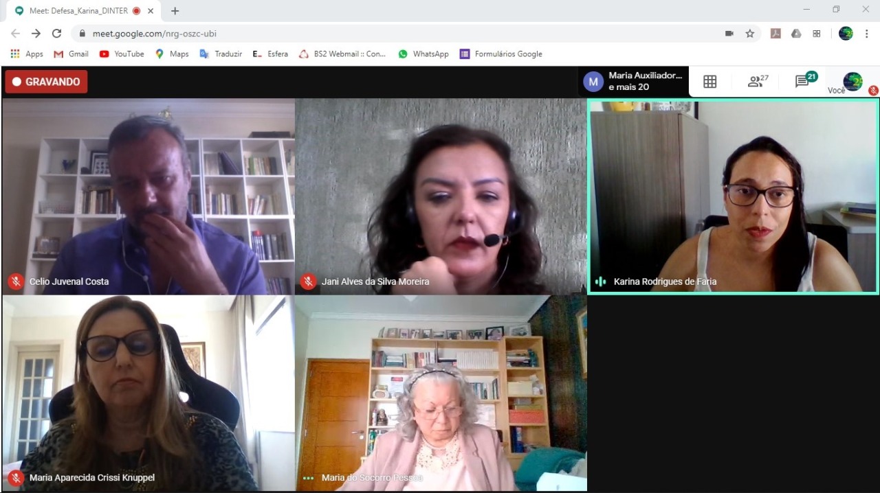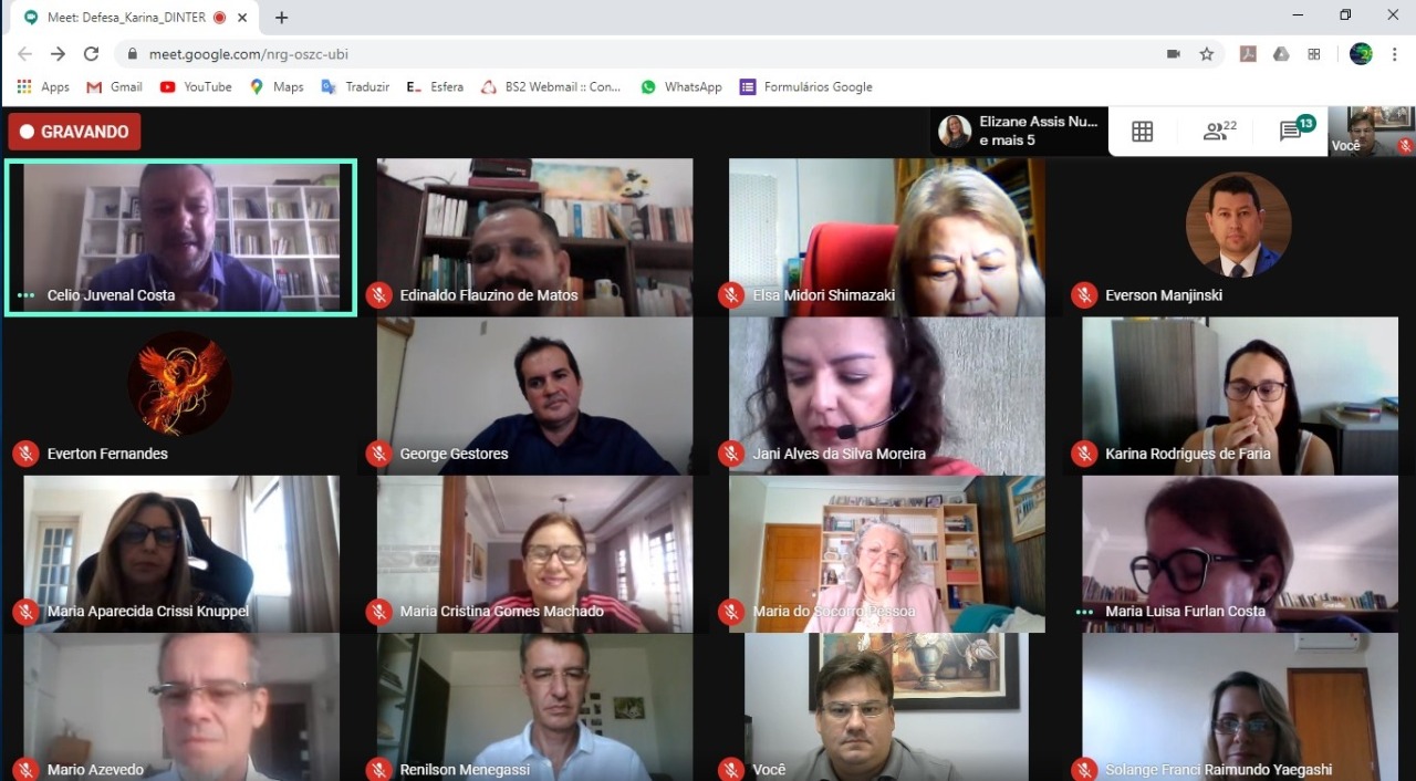 A banca examinadora foi composta pelos professores: Doutor Célio Juvenal Costa (UEM – Orientador), doutora Maria do Socorro Pessoa (Colaboradora do Laboratório LEIP na Universidade de Aveiro/Portugal/docente aposentada da UNIR), doutora Maria Aparecida Crissi Knuppel (UNICENTRO – Guarapuava/PR), doutor Renilson José Menegassi (UEM) e a doutora Jani Alves da Silva Moreira (UEM). Por conta da pandemia da COVID-19 a defesa ocorreu por vídeo/webconferência e contou com a participação especial (Momento que antecedeu a defesa) dos seguintes nomes: Professora doutora Solange Franci Raimundo Yaegashi (UEM – Coordenadora do PPE/UEM); Professor doutor George Queiroga Estrela (UNIR – diretor do campus de Guajará-Mirim); Professor doutor Edinaldo Flauzino de Matos (UNIR – Coordenador operacional do DINTER); Professor doutor Mário Luiz Neves de Azevedo (UEM – ex-coordenador do PPE/UEM); Professora doutora Maria Luisa Furlan Costa (UEM – PPE/UEM) e o senhor Hugo Alex da Silva (secretário do PPE-UEM).