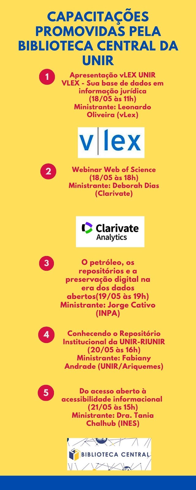 A Biblioteca Central da Fundação Universidade Federal de Rondônia (UNIR), convida toda a comunidade acadêmica e sociedade em geral para participar da agenda da semana do dia 18 a 21 de maio de 2020.