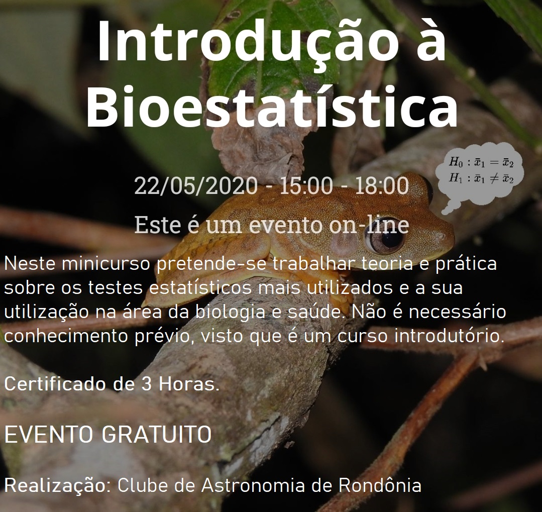 O Departamento de Física (DFIS) da Fundação Universidade Federal de Rondônia (UNIR) promoverá uma atividade vinculada ao programa seu de extensão: Uma viagem do passado ao futuro – Caminho das Estrelas, um minicurso de Introdução à Bioestatística.